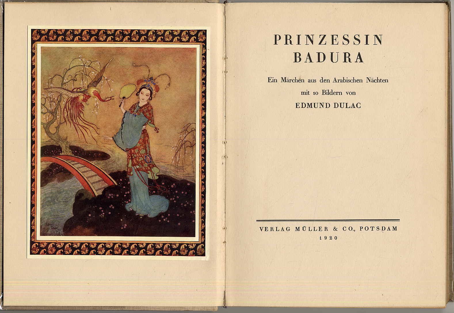 Dulac – Prinzessin Badura. Ein Märchen aus den Arabischen Nächten. Potsdam, Müller & Co., 1920. Ca. 26 x 19 cm. (8) S., 113 S., (3) Seiten. Mit 10 montierten farbigen Bildern von Edmund Dulac. Farbig illustr. Orig.-Leinenband. Im seltenen illustrierten Original-Leineneinband. Einband etwas berieben und leicht fleckig. Widmung (datiert 1921) auf Vorsatz.