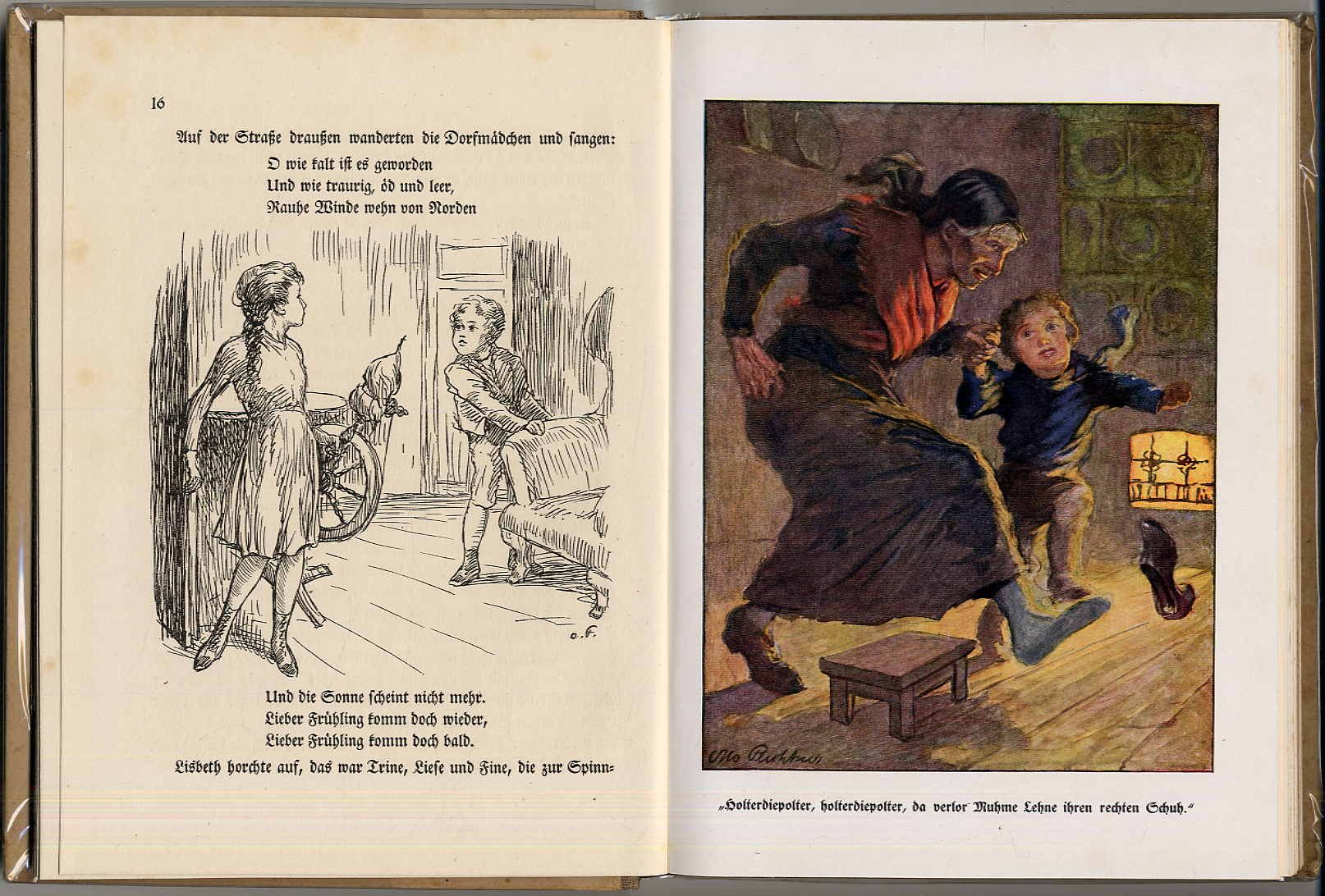 Hartwig, Paul Hermann: Traumjörgs Reise ins Frühlingsland. Ein deutsches Märchen. Berlin-Grunewald, Verlagsanstalt für Litteratur und Kunst H. Klemm, [1919]. Ca. 21,5 x 20 cm. 118 S., (2) Seiten. Mit zahlreichen, teils farbigen ganzseitigen, Illustrationen von Otto Flechtner. Farbig illustr. Orig.-Halbleinenband. Einband etwas berieben und etwas fleckig. Klammerung leicht angerostet. Aus dem Inhalt u.a.: Traumjörg und Muhme Lene; Bei der Grabfrau; In der Werkstatt des Frühlings; Das Wasser des Lebens; Ostersegen.