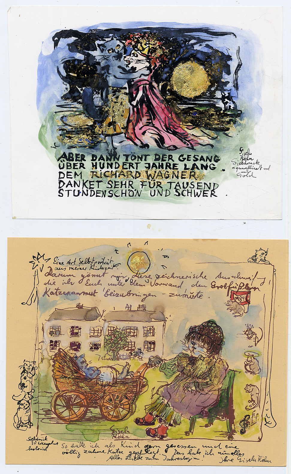 Röhn, Gisela: Tristan Blue und Isolde Puss. tristans Kindheit und Jugend. Katzenmäßig gezeichnet und erzählt. Hambug, Christinas, 1987. Querformat, ca. 18 x 22 cm. (80) Seiten. Mit teils farbigen und teils ganzseitigen Illustrationen von Gisela Röhn. Farbig illustr. Orig.-Pappband. Beigefügt: Eigenhändig bezeichneter und signierter, aquarellierter und goldgehöhrter Siebdruck in Klappkarte mit einer Illustration aus dem Buch. Beigefügt: Kolorierter und goldgehöhter Siebdruck (einer von 30 Ex.) mit umfangreicher eigenhändiger Beschriftung und Unterschrift sowie 3 gezeichneten Katzen von Gisela Röhn (1921-1993, Malerin und Grafikerin): „Eine Art Selbstporträt aus meiner Kindheit.“ Rückseits handschriftlicher Brief an einen Buchhändler, datiert 1984. Sehr gutes Exemplar.