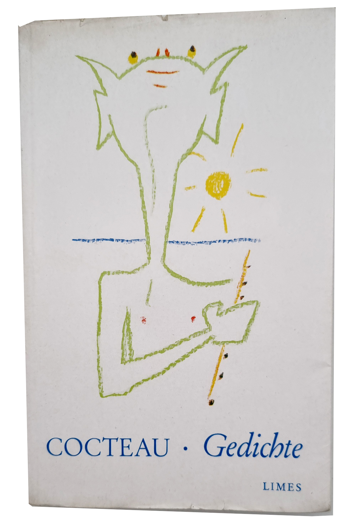 Cocteau, Jean: Gedichte. Zweisprachige Ausgabe vom Dichter illustriert. Wiesbaden, Limes Verlag, 1955. Ca. 19,5 x 12 cm. 123 S., (5) Seiten. Mit Illustrationen von Jean Cocteau. Farbig illustrierter Orig.-Karton. Ins Deutsche übertragen von Georg Schneider (1902-1972, Übersetzer, Schriftsteller und Politiker). Exemplar aus der Bibliothek Schneiders, mit dessen Signatur auf dem Vorsatzblatt, darüber einmontiert Vorderumschlag eines Briefkuverts mit eigenhändiger Adressangabe Schneiders von Jean Cocteau (1889-1963, franz. Schriftsteller, Maler und Regisseur), mit Briefmarken und Luftpostaufkleber. Im Buch einmontiert einige Zeitungsausschnitte und maschinenschriftliches Gedicht mit Übersetzung. Einband an den Kanten etwas bestoßen, sonst gutes Exemplar.