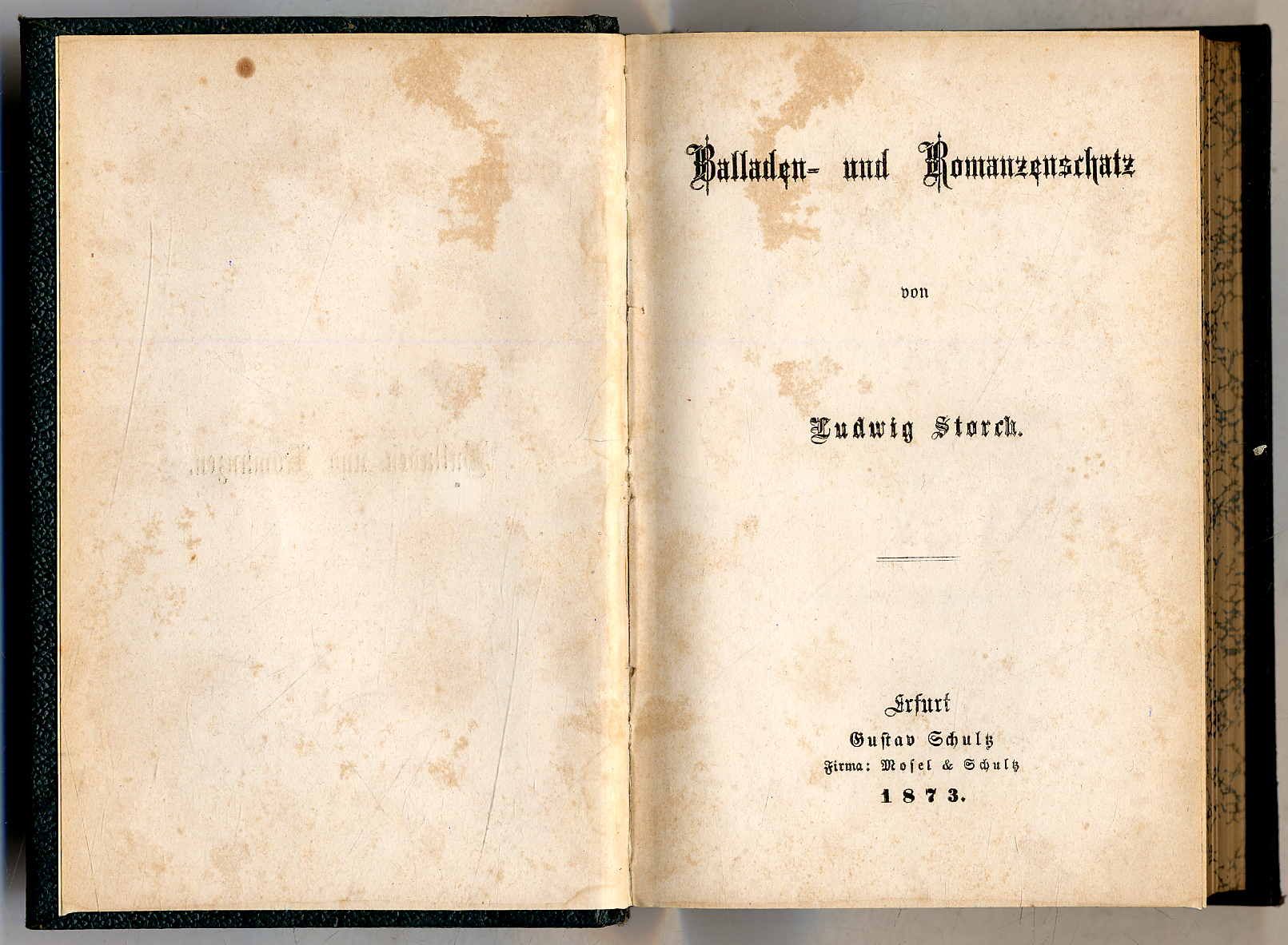 Storch, Ludwig: Balladlen- und Romanzenschatz. Erfurt, Gustav Schultz, 1873. Ca. 14 x 9,5 cm. (8) S., 343 Seiten. Späterer grüner Leineneinband mit Rückengoldprägung. Seiten teils braunfleckig, anfangs auch stärker.