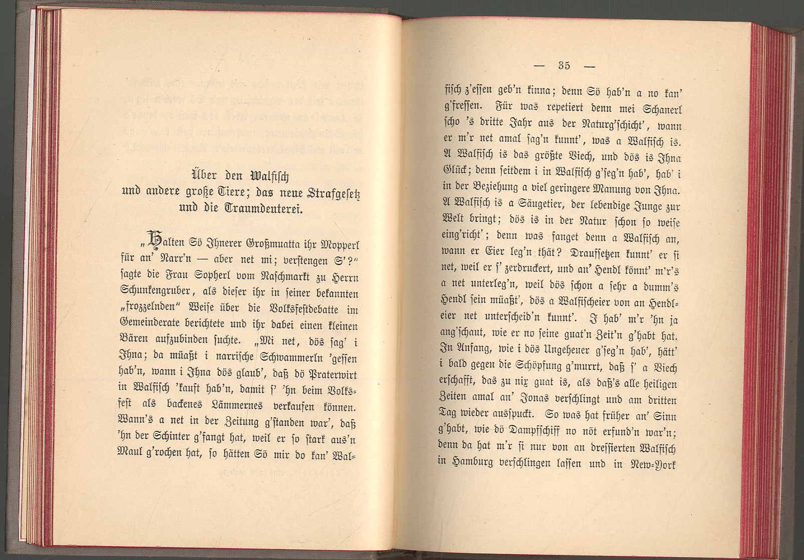 Chiavacci, Vincenz: Eine, die’s versteht. Lokal-politische Standreden der Frau Sopherl vom Naschmarkt. Stuttgart, Adolf Bonz & Comp., 1896. Ca. 16,5 x 11,5 cm. VIII S., 248 Seiten. Farbig illustr. Orig.-Leinenband. „Denn die Frau Sopherl ist eine „b’lehrte und b’lesen“ Person, die an alle Dinge des öffentlichen Lebens resolut herantritt und sie mit ihrem gesunden Verstand und ihrem Mutterwitz zergliedert. Als echtes Wiener Kind ist sie nie um einen Ausdruck verlegen …“ Gutes Exemplar im dekorativen Originaleinband.
