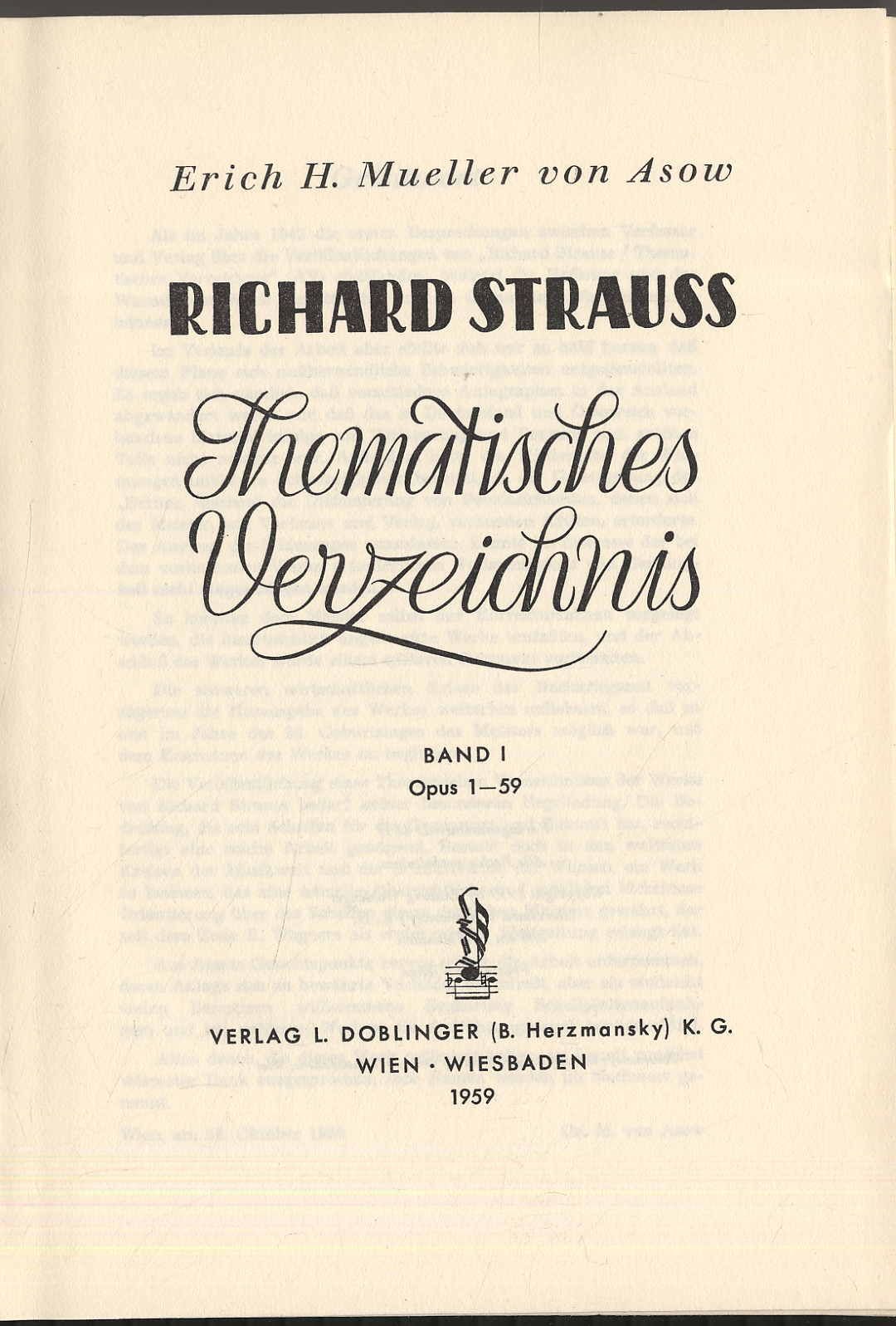 Strauss – Müller von Asow, Erich Hermann: Richard Strauss. Thematisches Verzeichnis Bd. 1: Opus 1 – 59. Wien u. Wiesbaden, L. Doblinger, 1959. Ca. 27 x 19,5 cm. (4) S., 511 Seiten. Mit Porträt-Abbildung und zahlreichen Notenbeispielen. Blauer Orig.-Leinenband. Gutes Exemplar.