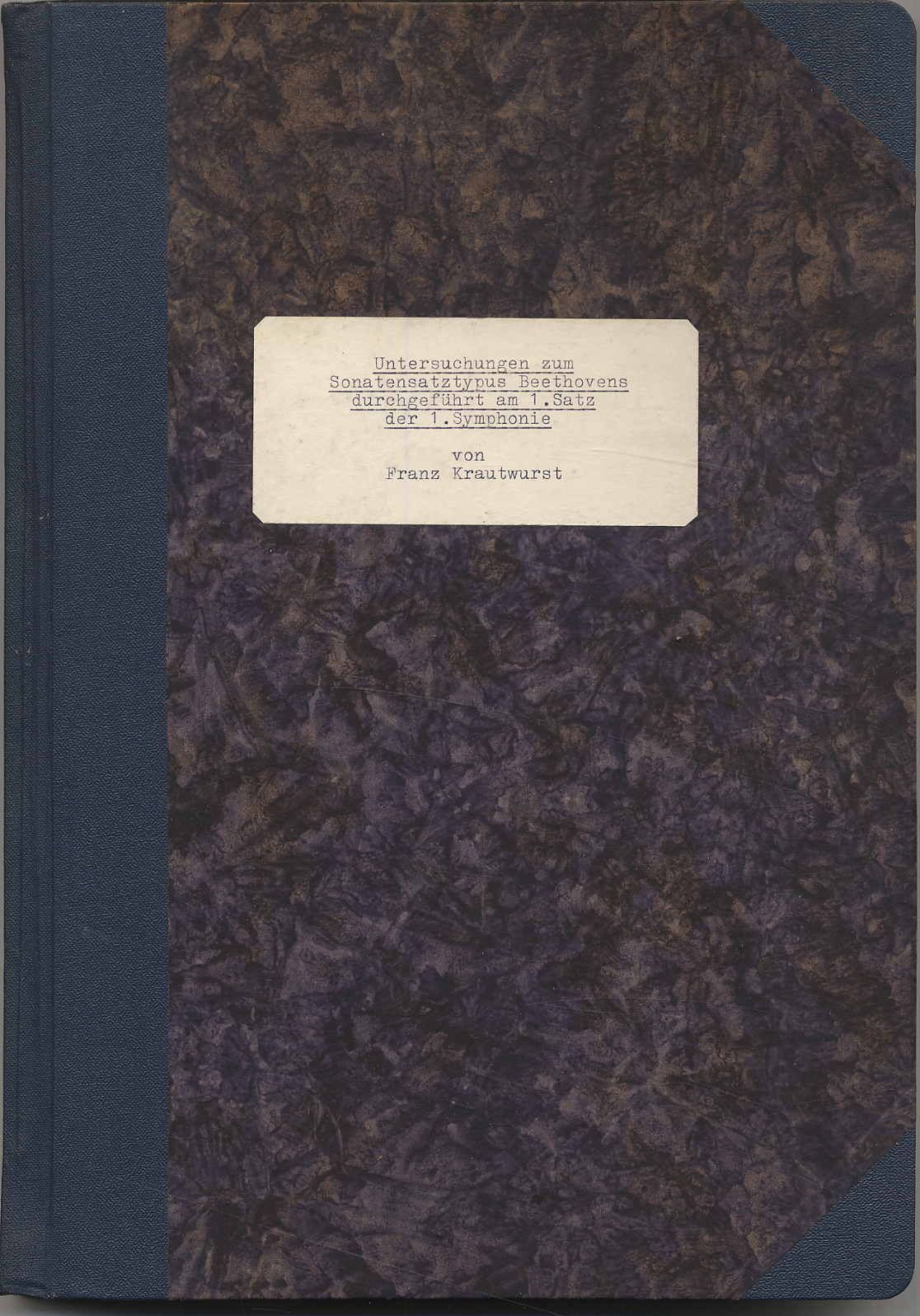 Beethoven – Krautwurst, Franz: Untersuchungen zum Sonatensatztypus Beethovens, durchgeführt am I. Satz der 1. Symphonie. Dissertation. München, 1950. Ca. 30 x 21 cm. (10) einseitig bedruckte Blätter, 193 einseitig bedruckte Blätter. Halbleinenband der Zeit. Typoskript-Durchschlag der Dissertation von Franz Krautwurst (1923-2015, Musikwissenschaftler).