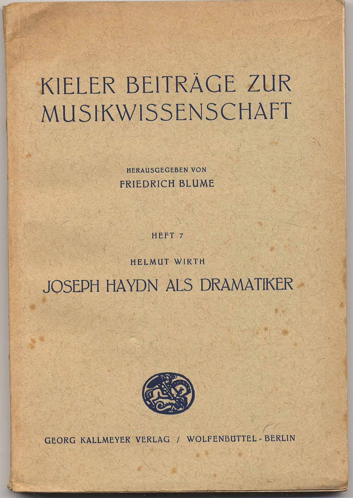 Haydn – Wirth, Helmut: Joseph Haydn als Dramatiker. Sein Bühnenschaffen als Beitrag zur Geschichte der deutschen Oper. Wolfenbüttel, Georg Kallmeyer, 1940. Ca. 24 x 16,5 cm. 197 Seiten. Mit Notenbeispielen. Originalkartonierter Einband. Aus der Reihe: Kieler Beiträge zur Musikwissenschaft, 7. Mit Exlibris. Handschriftl. Anmerkung zum Autor auf Titelblatt. Einband und Schnitt etwas stockfleckig.