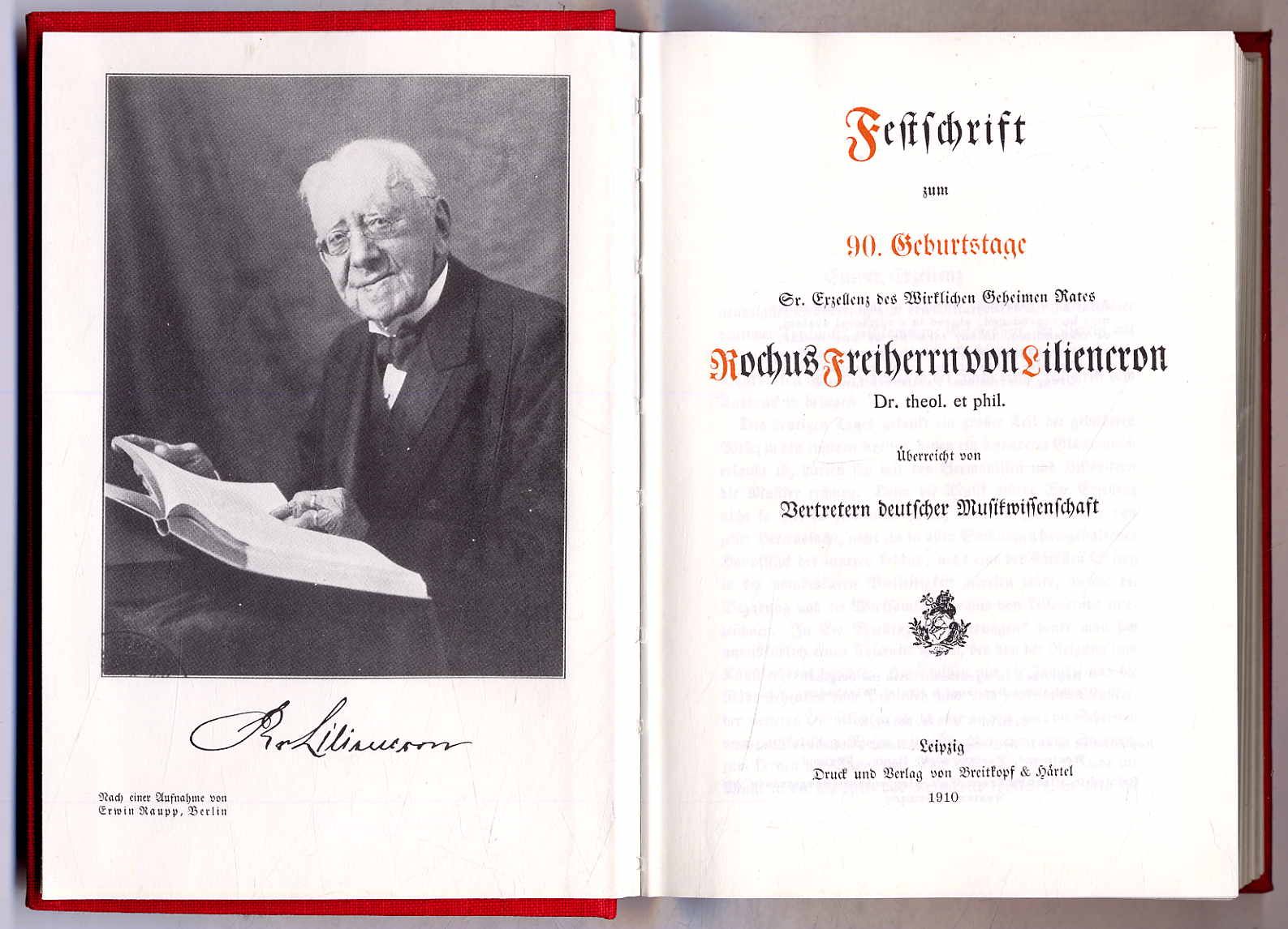 Liliencron – Festschrift zum 90. Geburtstage Sr. Excellenz des Wirklichen Geheimen Rates Rochus Freiherrn von Liliencron. Überreicht von Vertgretern deutscher Musikwissenschaft. Reprint der Ausgabe Leipzig 1910. Farnborough, Gregg International Publ. 1970. Ca. 19,5 x 13 cm. (10) S., 463 Seiten. Mit einem Porträt, einigen Tafeln mit Abbildungen und zahlreichen Notenbeispielen. Roter Orig.-Leinenband. Gutes Exemplar.