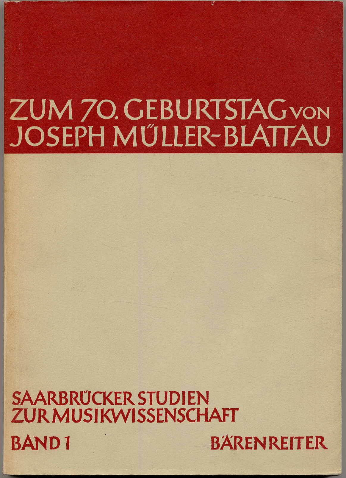 Mahling, Christoph-Hellmut (Hrsg.): Zum 70. Geburtstag von Joseph Müller-Blattau. Im Auftrage des Musikwissenschaftlichen Instituts der Universität des Saarlandes herausgegeben. Kassel u.a., Bärenreiter Verlag, 1966. Ca. 24 x 12,5 cm. 340 Seiten. Mit 31 Abbildungen auf Tafeln. Originalkartonierter Einband. Aus der Reihe: Saarbrücker Studien zur Musikwissenschaft, Band 1. Mit zahlreichen Beiträgen bedeutender Musikwissenschaftler. U.a.: Th. W. Adorno: Über eine Schwierigkeiten des Komponierens heute; Carl Dahlhaus: Historismus und Tradition; K. G. Fellerer: Zur musikalischen Akustik im 18. Jhdt.; E. Klusen: Über landschaftliche Volksmusikforschung; A. Quellmalz: Der Spielmann, Komponist und Schulmeister Paul A. Wüst (um 1470- um 1540); M. Schneider: An anamitisches Wiegenlied; B. Stäblein: Zur Musik des Ludus de Antichristo. Gutes Exemplar.