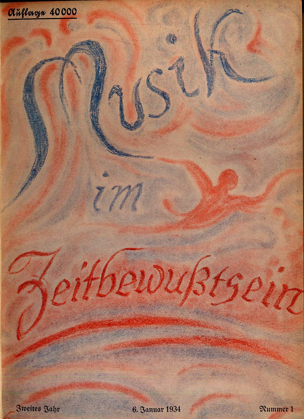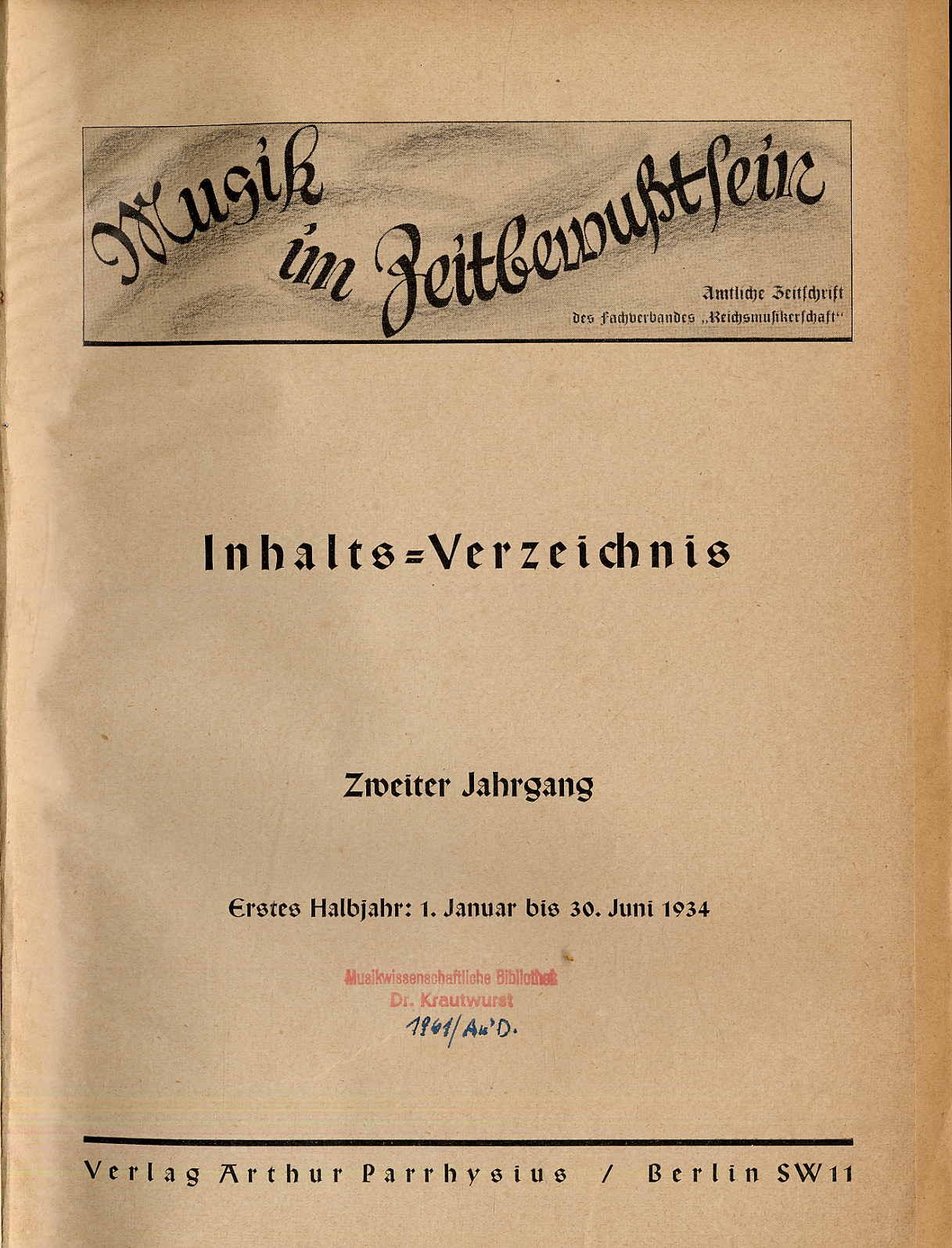 Musik im Zeitbewußtsein. Amtliche Zeitschrift des Fachverbandes „Reichsmusikerschaft“. 2. Jahrgang, 1. Halbjahr. Berlin, Arthur Parryhsius, 1934. Ca. 30,5 x 23 cm. Je Heft ca. 24 Seiten. Mit Illustrationen. Blauer Orig.-Leinenband. Goldprägung am Deckel berieben. Hefte 1 bis Heft 25/26. Roter Stempel einer musikwissenschaftlichen Privatbibliothek auf Innendeckel und Titelblatt