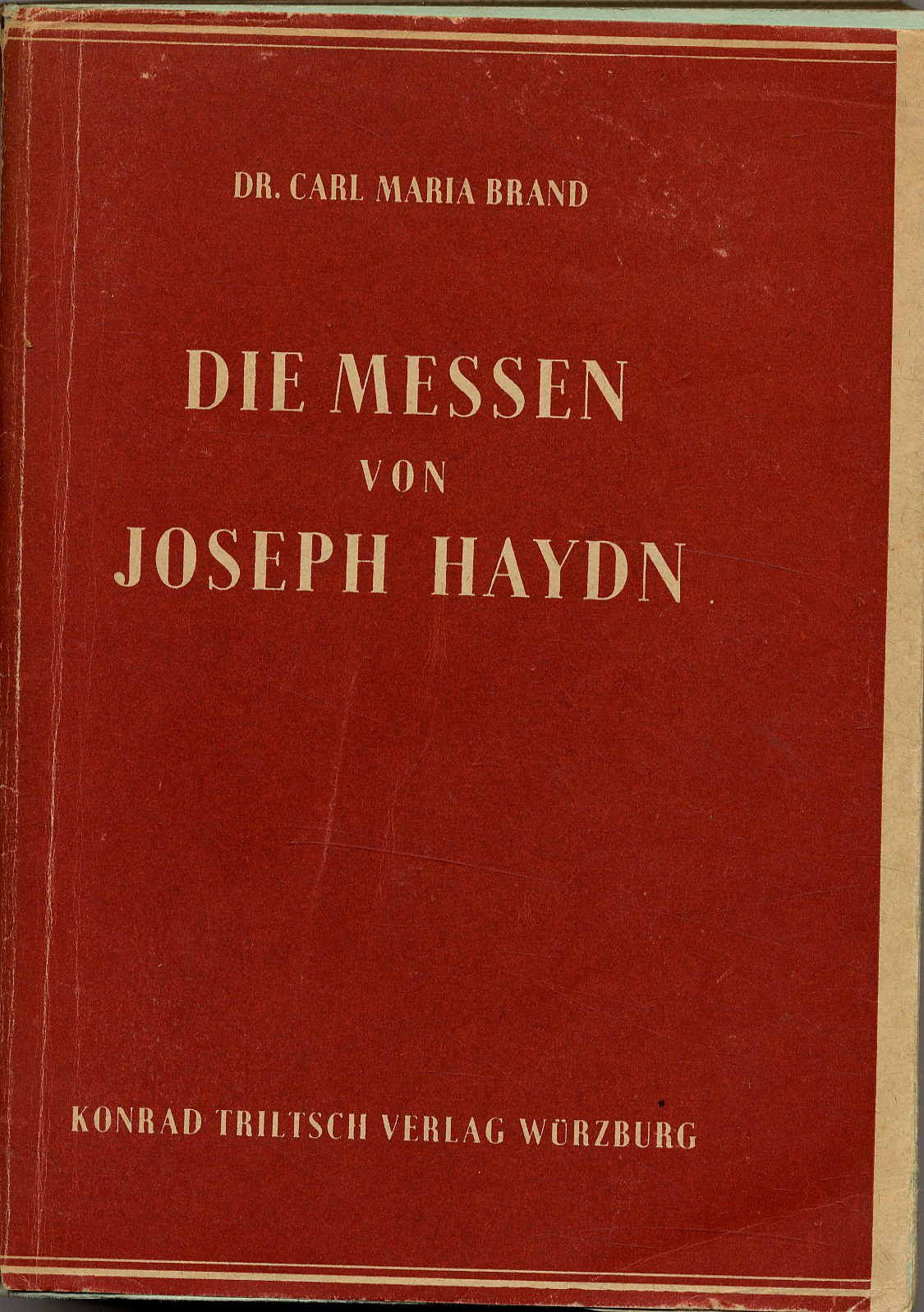 Haydn – Brand, Carl Maria: Die Messen von Joseph Haydn. Würzburg, Konrad Triltsch Vlg., 1941. Ca. 23,5 x 17,5 cm. (8) S., 548 Seiten. Originalkartonierter Einband. Aus der Reihe:Musik und Geistesgeschichte Berliner Studien zur Musikwissenschaft, Band II. Einband etwas bestoßen, Rücken kleiner Einriss. Schnitt leicht fleckig. „Es ist von jetzt an nicht mehr möglich, Unkenntnis und Unbekanntschaft mit Haydns Messen vorzutäuschen.“ (Geleitwort von Alfred Schnerich).