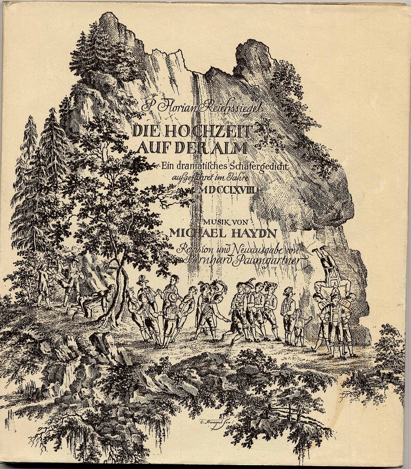 Haydn – Reichssiegel, Florian: Die Hochzeit auf der Alm. Ein dramatisches Schäfergedicht aufgeführet im Jahre 1768. Die Musik zu diesem Spiele hat der berühmte Tonkünstler Herr Michael Haydn verfertigt. Revision und Neuausgabe von Bernhard Paumgartner. Salzburg u. Stuttgart, Das Bergland-Buch, 1959. Ca. 24,5 x 21 cm. 71 Seiten. Mit einer Farbtrafel und zahlreichen Noten. Grüner Orig.-Leinenband mit Schutzumschlag. Schutzumschlag leicht angerändert, mit handschriftlicher Notiz auf der Innenklappe. Gutes Exemplar.