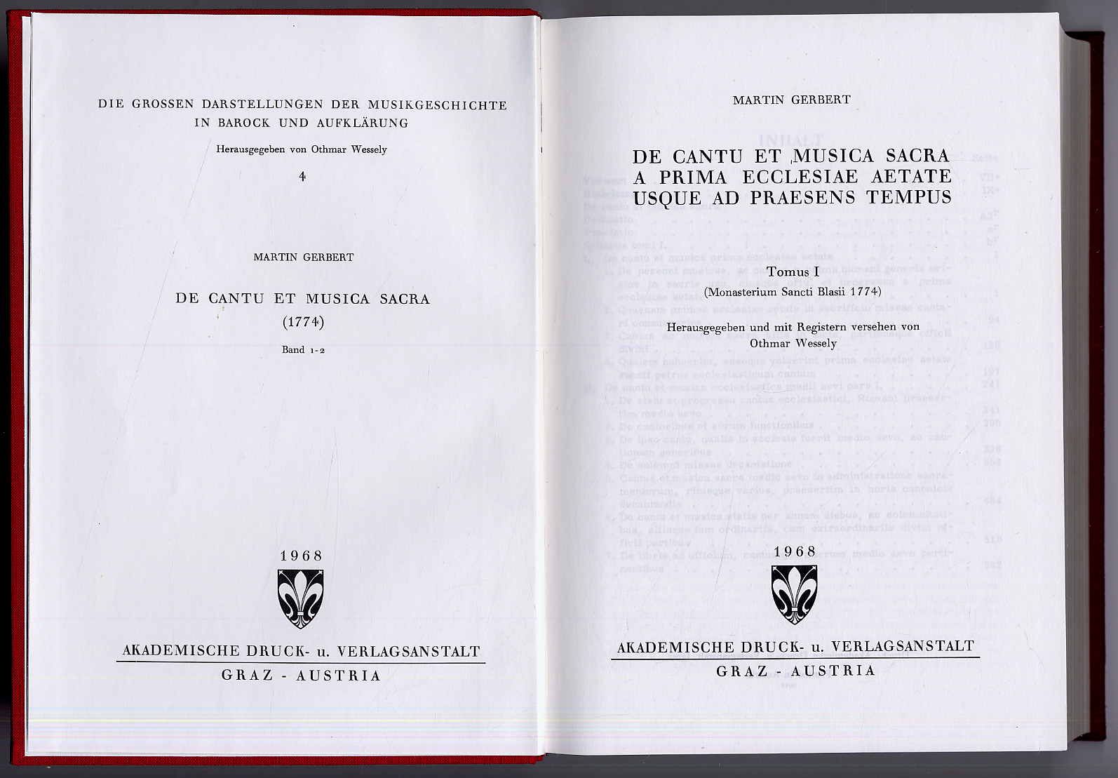 Gerbert, Martin: De cantu et musica sacra a prima ecclesiae aetate usque ad praesens tempus. Tomus I (Monasterium Sancti blasii 1774). Hrsgg. und mit Registern versehen von Othmar Wessely. Graz, Akademische Druck- und Verlagsanstalt, 1968. Ca. 24,5 x 17 cm. LXI S., 590 Seiten. Mit Notenbeispielen und 6 teils gefalteten Beilagen. Roter Orig.-Leinenband. Aus der Reihe: Die grossen Darstellungen der Musikgeschichte in Barock und Aufklärung. Band 1 (von 2). Reprint der Ausgabe 1774. Text in Latein.