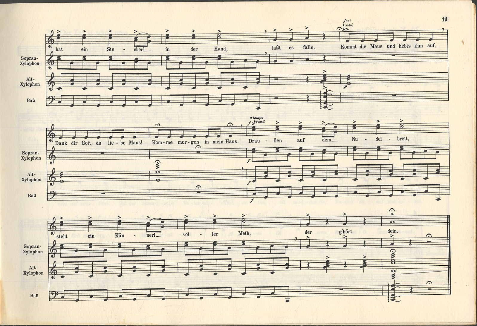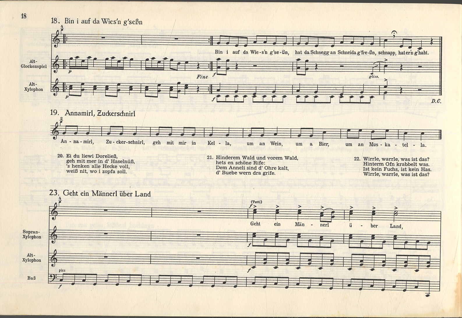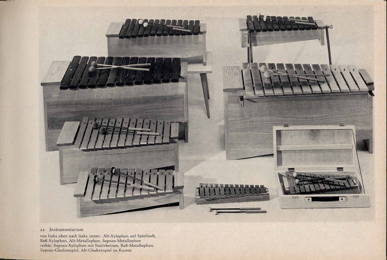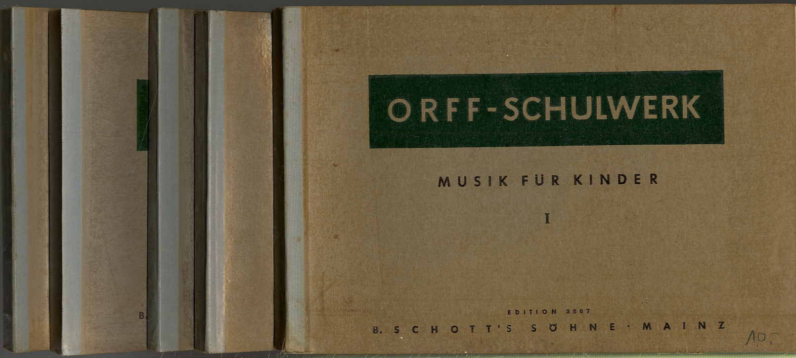 Orff – Orff-Schulwerk. Musik für Kinder. 5 Bände Mainz, B. Bschott’s Söhne, 1950-1954. Querformat, ca. 18,5 x 27,5 cm. Je Band zwischen ca. 120 und 150 Seiten mit Noten. Bnd 1 mit 24 Abbildungen auf Tafeln. Originalkartonierter Einband. Rücken mit Leinenstreifen verstärkt. Bände mit Klarsichtschutz versehen. Namenszug auf Titelblatt. Schnitt etwas stockfleckig. 1. Band Einband sowie die ersten Blätter fleckig. Alle fünf Bände: Im Fünftonraum; Dur: Bordun-Stufen; Dur: Dominanten; Moll: Bordun-Stufen; Moll: Dominanten.