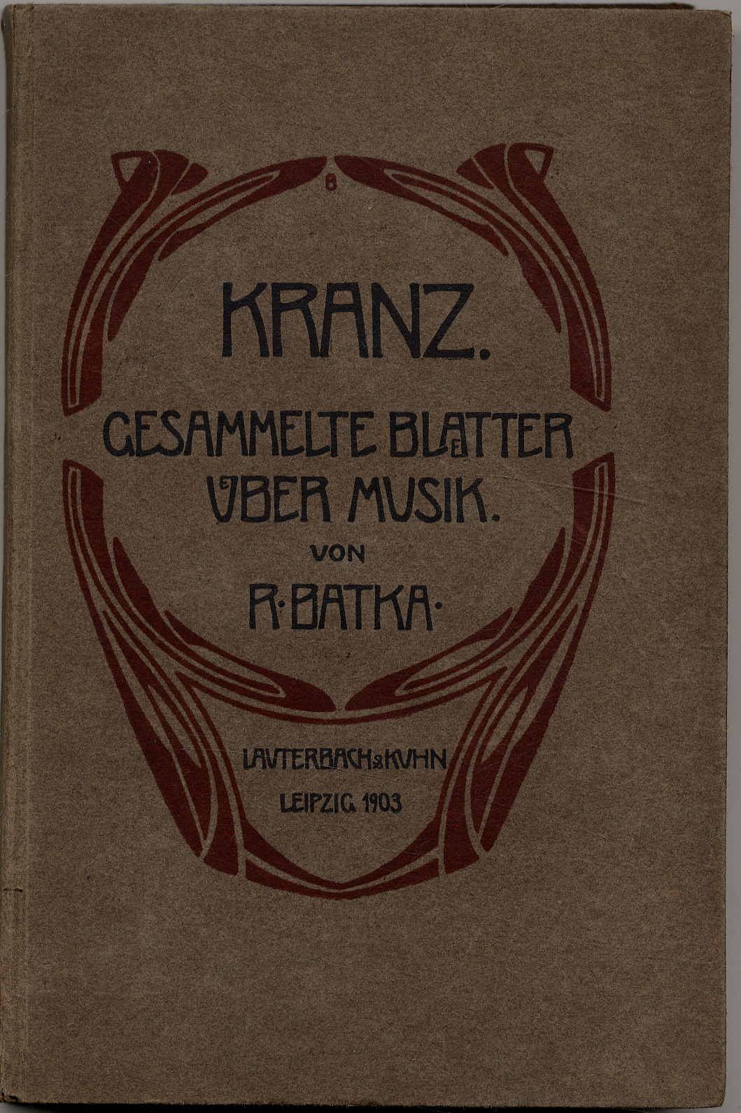 Batka, R[ichard]: Kranz. Gesammelte Blätter über Musik. Leipzig, Lauterbach & Kuhn, 1903. Ca. 22,5 x 15 cm. VI S., 308 Seiten. Originalkartonierter Einband. Breitrandiges, unbeschnittenes Exemplar. Aus dem Inhalt u.a.: Wagneriana; Totenkränze; Die Musik der alten Griechen; Die Guntramlegende; Hans Pfitzners Musikdrama „Der arme Heinrich“; Die moderne Oper; Die Würdigung Hugo Wolfs; Papierne Musik. Gutes Exemplar.