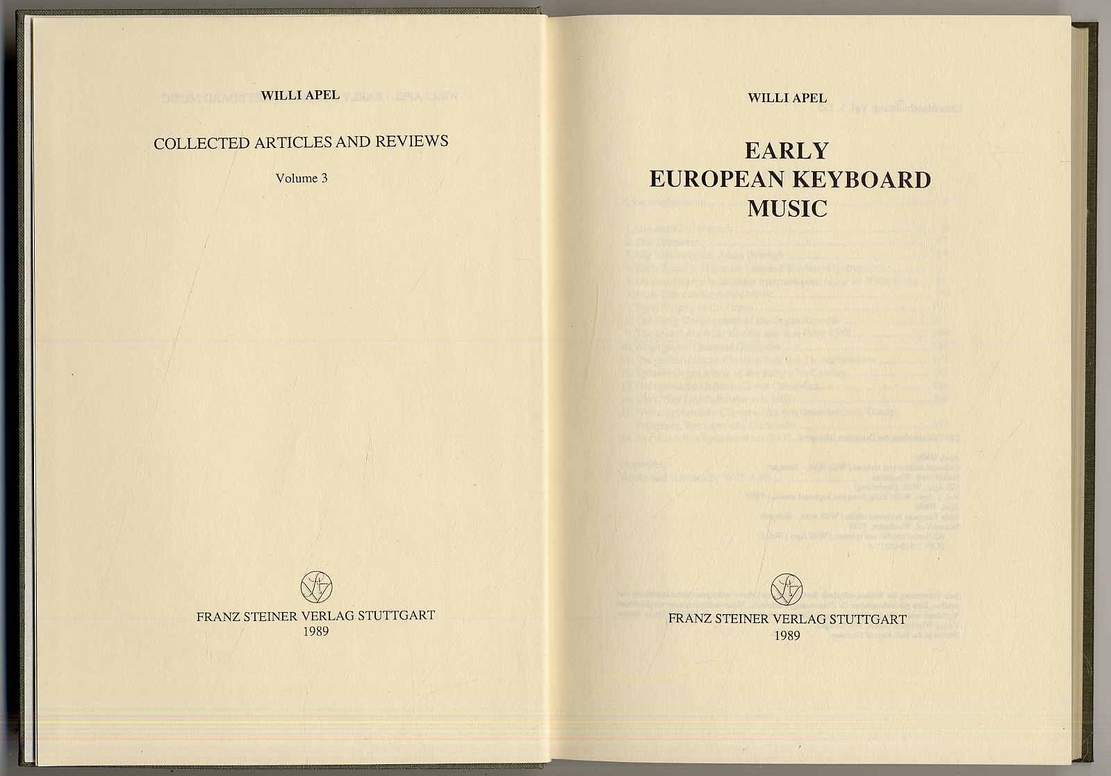 Apel, Willi: Early European Keyboard Music. Stuttgart, Franz Steiner Verlag, 1989. Ca. 24,5 x 17,5 cm. 225 Seiten. Mit Illustrationen und zahlreichen Notenbeispielen. Grauer Orig.-Leinenband. Aus der Reihe: Collected articles and reviews, volume 3. Texte in deutsch, englisch oder französisch. U.a.: Die alte Klaviermusik; Early German Keyboard Music; Early history of the organ; Attaingnant: Quatorze Gaillardes; Die süditalienische Clavierschule des 17. Jahrhunderts; Das Celler Orgeltabulatur von 1601.