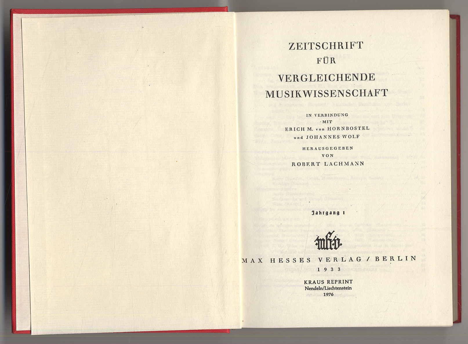 Lachmann, Robert (Hrsg.): Zeitschrift für Vergleichende Musikwissenschaft. Reprint der Ausgabe Berlin 1933. 1.-3. Jahrgang. Nendeln, Kraus Reprint, 1976. Ca. 21 x 15 cm. Je Jahrgang ca. 96 Seiten. Mit zahlreichen Notenbeispielen. Roter Orig.-Leinenband. Gutes Exemplar.