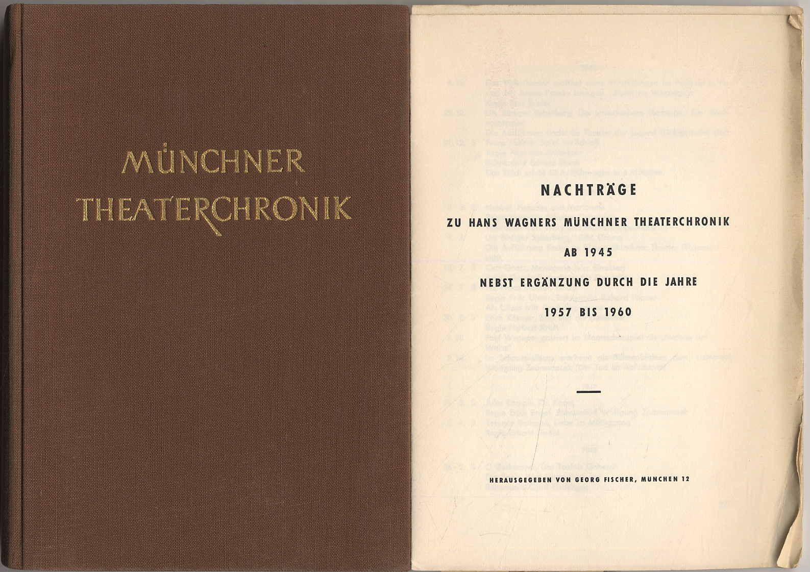 Wagner, Hans: 200 Jahre Münchner Theaterchronik 1750-1950. Theatergründungen, Ur- und Erstaufführungen, berühmte Gastspiele und andere Ereignisse undKuriosa aus dem Bühnenleben. München, Wissenschaftlicher Verlag Robert Lerche, 1958. Ca. 21 x 15 cm. 263 Seiten. Mit Abbildungen auf Tafeln. Brauner Orig.-Leinenband. Beigefügt: Nachträge … ab 1945 nebst Ergänzung durch die Jahre 1957-bis 1960 + Register. Mit ganzseitiger privater Widmung auf Vorsatz.