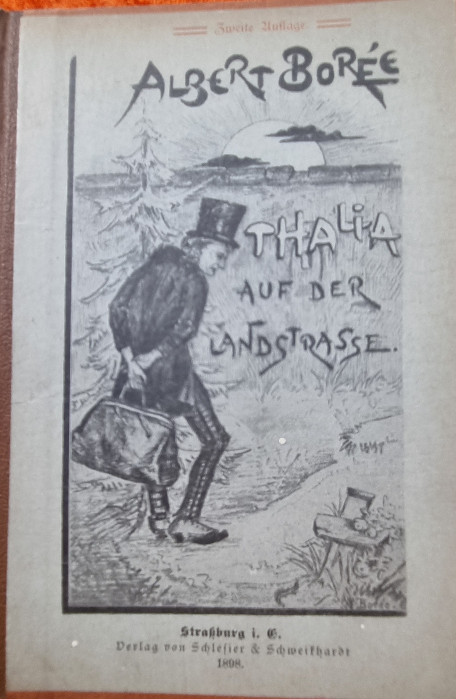 Borée, Albert: Thalia auf der Landstraße. Heiteres und Ernests aus dem Bühnenleben. 2. Auflage. Straßburg, Schlesier 6 Schweißhardt, 1898. Ca. 18 x 12,5 cm. 176 Seiten. Mit einem Porträt-Titelbild, gezeichnet vom Verfasser. Halbleinenband mit aufgezogenem Original-Vorder- und Hinterdeckel. Borée (1864-1910, Schauspieler).