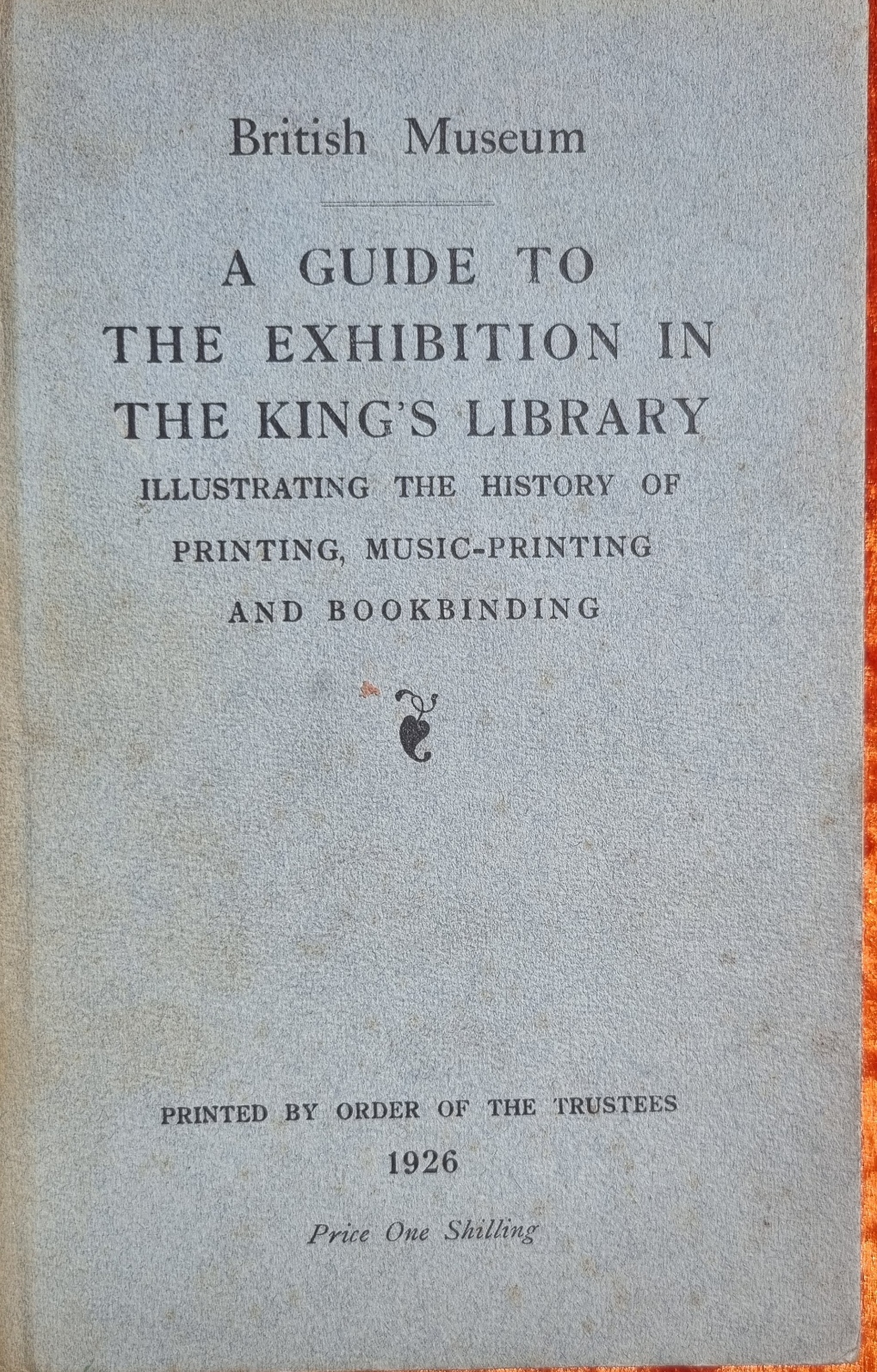 British Museum. A guide to the exhibition in the King’s Library illustrating the history of printing, music-printing and bookbinding. Printed by order of the trustees, 1926. Ca. 21 x 13 cm. 180 Seiten, mit Illustrationen. Orig.-Halbleinenband. Einband etwas gebräunt, sonst gutes Exemplar. Text auf englisch.