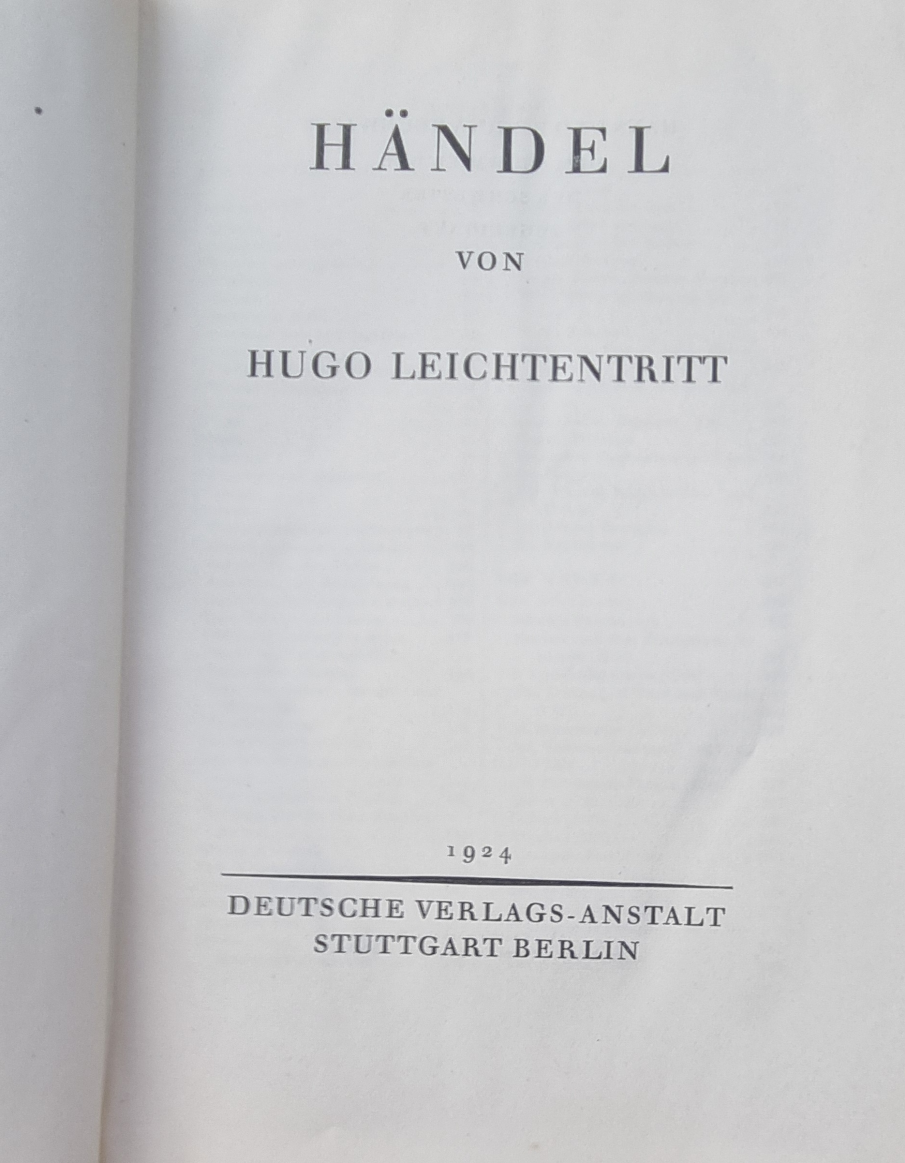 Händel – Leichtentritt, Hugo: Händel. Stuttgart u.a., Deutsche Verlags Anstalt, 1924. Ca. 23,5 x 16 cm. 871 Seiten. Halblederband der Zeit mit Rückenschild und Rückengoldprägung. Das Buch „will die Erscheinung Händels aus dem geistigen und kulturellen Leben seiner Zeit heraus verständlich machen, es will den Künstler nach der Gesamtheit seines Lebenswerks abschätzen …“ (Einführung).