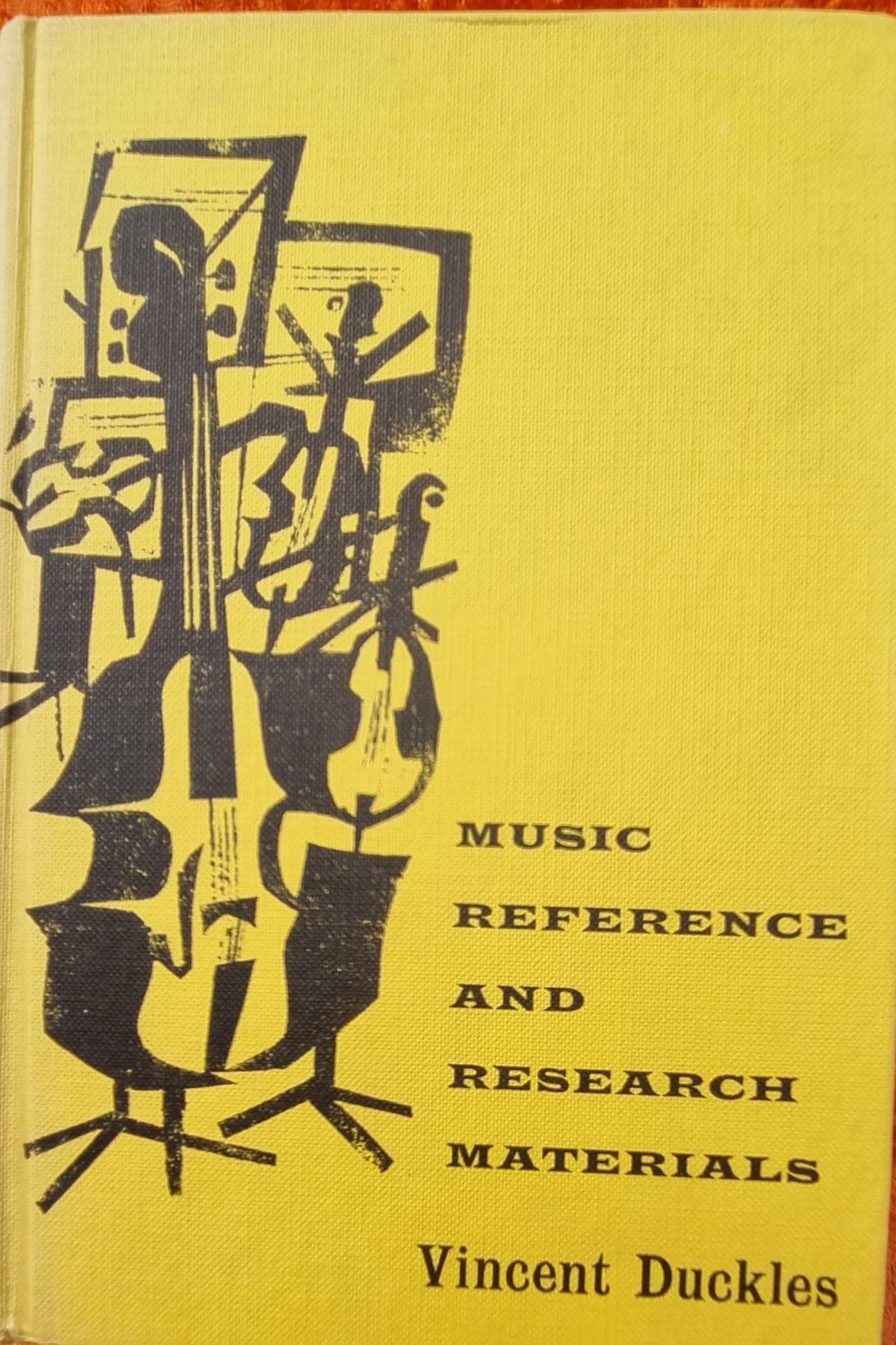Duckles, Vincent: Music reference and research materials. An annotated bibliography. London, Collier-Macmillan, 1964. Ca. 22 x 14,5 cm. IX S., (3) S., 331 Seiten. Illustrierter gelber Original-Leinenband. Mit handschriftlicher Widmung von Vincent H. Duckles (1913–1985, Leiter der Musikbibliothek in Berkley). Text auf englisch.