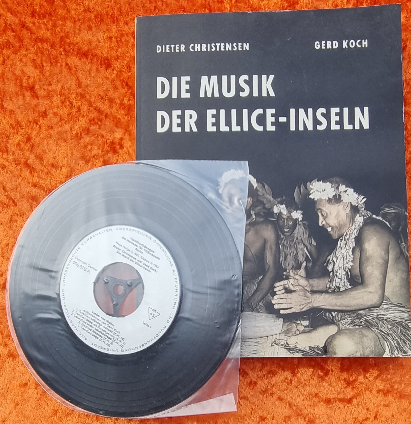 Christensen, Dieter und Gerd Koch: Die Musik der Ellice-Inseln. Berlin, Museum für Völkerkunde, 1964. Ca. 24 x 18 cm. 246 Seiten. Mit Abbildungen, zahlreichen Notenbeispielen und einer beigefügten Schallplatte. Illustrierter orig.-kartonierter Einband. Rücken etwas ausgeblichen, sonst gutes Exemplar. Mit Schallplatte. „Die hier veröffentlichten Lieder sind repräsentative Beispiele der altpolynesischen Musik im Ellice-Archipel.“ (Vorwort).