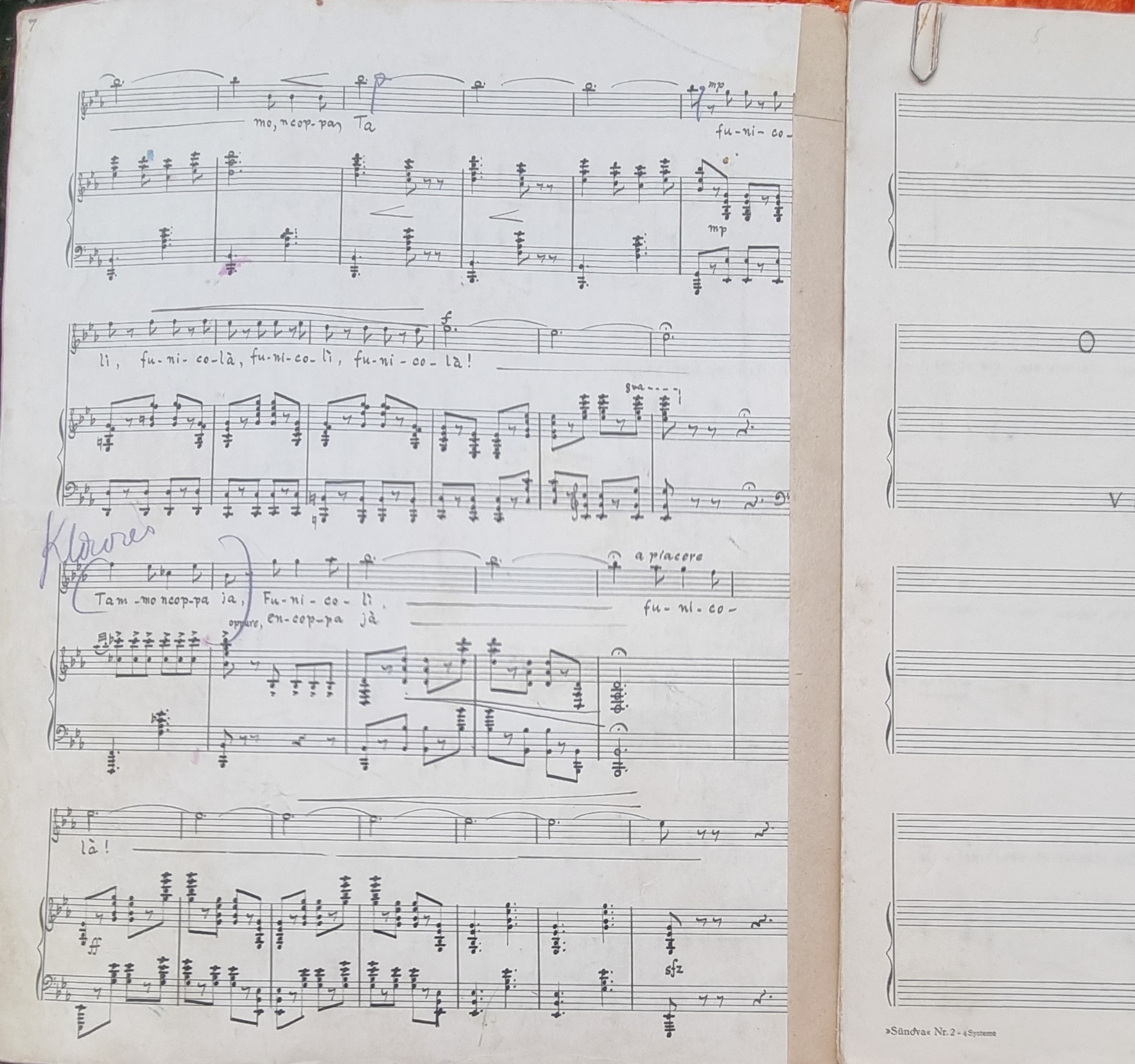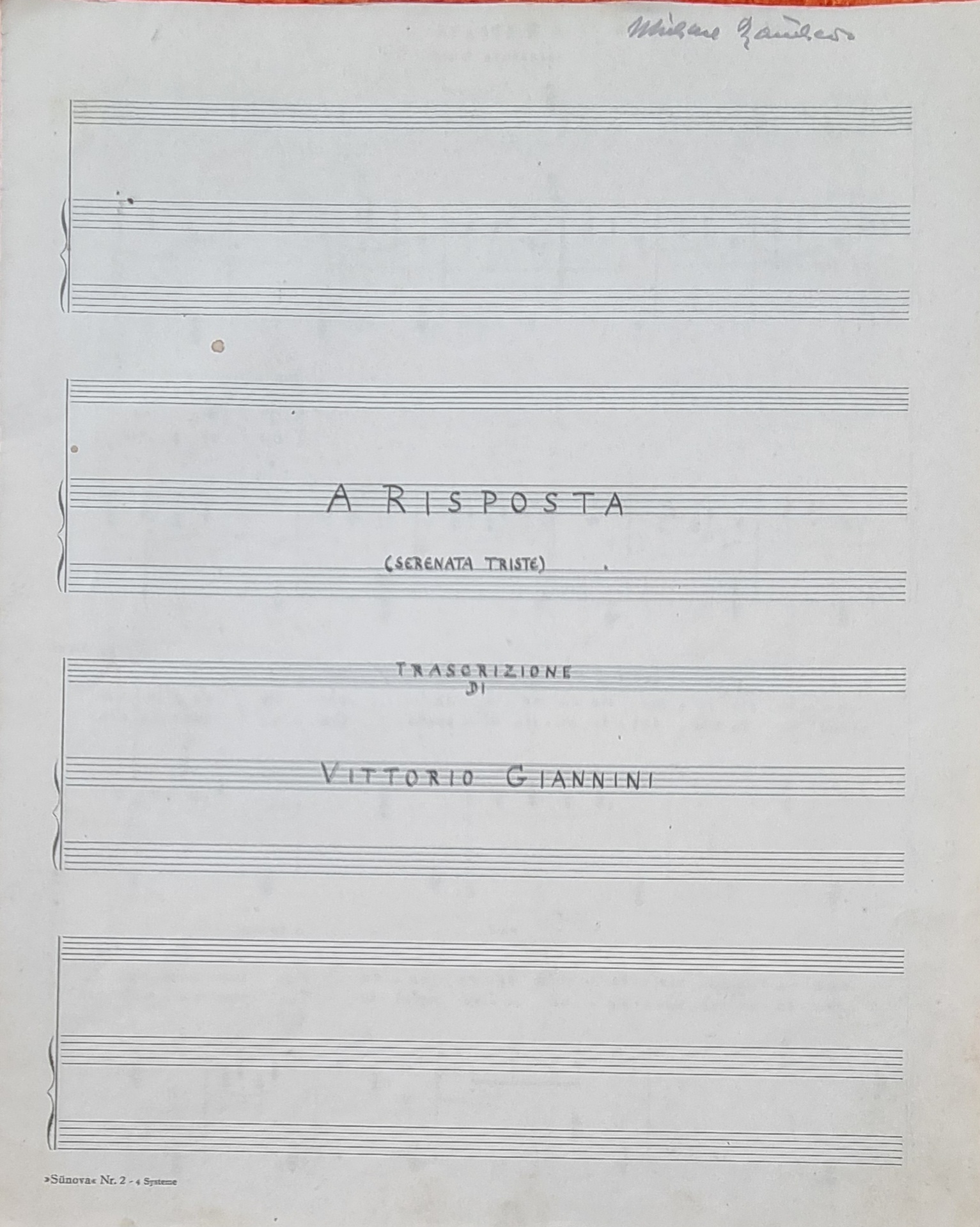 Italienische Volkslieder. A Risposta, Funicoli – Funicola, O Marenaiello, Sienteme Sole. Handschriftlich vorliegende Transkription von Vittorio Giannini für eine Singstimme mit Klavierbegleitung. Möglicherweise eigenhändig vom US-amerikanischen Komponist italienischer Abstammung Vittorio Giannini (1903-1966) erstellte Reinschriften seiner Transkriptionen. Vereinzelt mit Änderungen im Notentext in Bleistift. Mit kleineren Randeinrissen. Aus der Notenbibliothek des Liedbegleiters und Pianisten Michael Raucheisen, jedes Heft mit seinem eigenhändigen Namenszug.