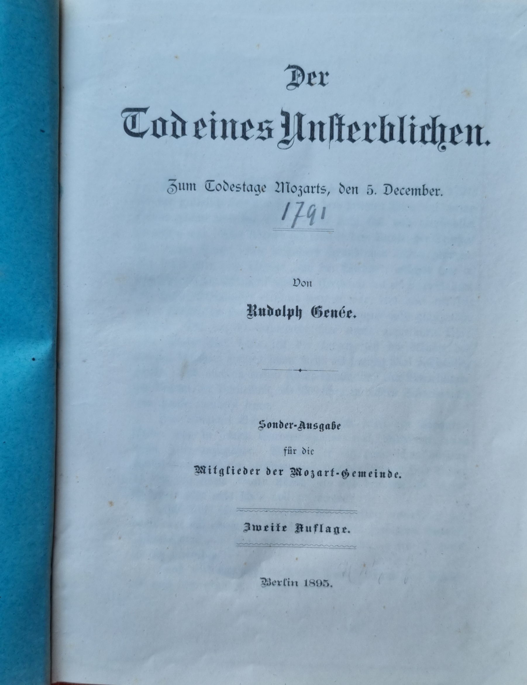 Mozart – Genée, Rudolph: Der Tod eines Unsterblichen. Zum Todestage Mozarts, den 5. December. Sonoder-Ausgabe für die Mitglieder der Mozart-Gemeinde. 2. Auflage. Berlin, 1895. Ca. 21 x 15 cm. 201 Seiten. Mit Abbildungen und Notenfaksimiles. Halbleinenband der Zeit. Teils mit Bleistiftanmerkungen.