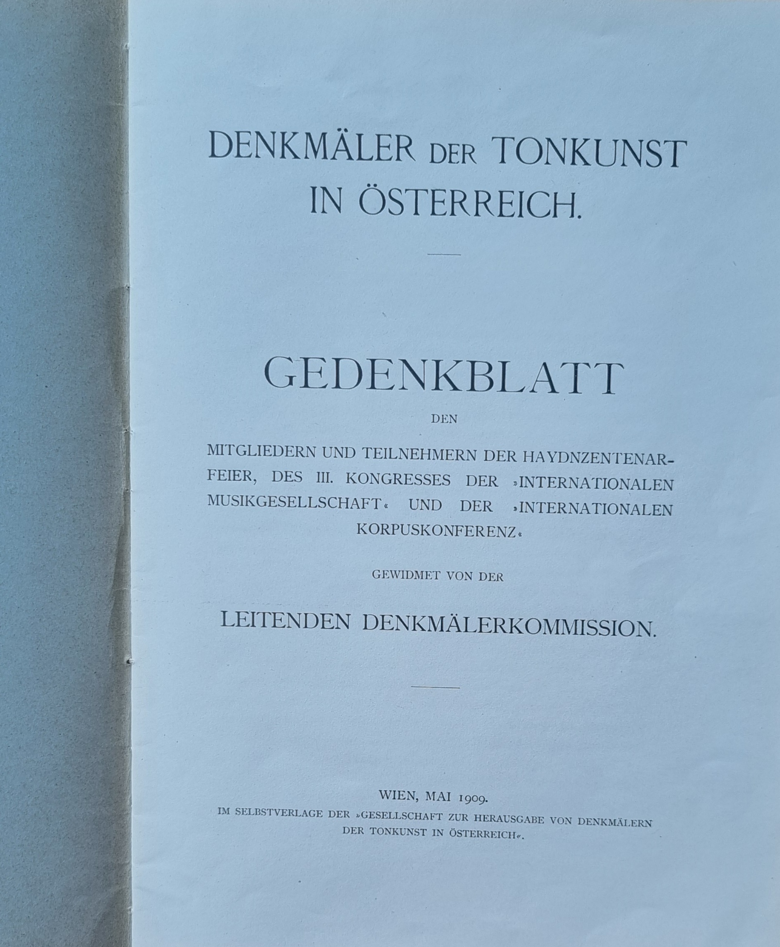 Denkmäler der Tonkunst in Österreich. Gedenkblatt den Mitgliedern und Teilnehmern der Haydnzentenar-Feier, des III. Kongresses der Internationalen Musikgesellschaft und der Internationalen Korpuskonferenz gewidmet von der Leitenden Denkmälerkommission. Wien, Selbstverlag, 1909. Ca. 27 x 18,5 cm. 29 Seiten. Halbleinenband der Zeit mit eingebundener Originalbroschur. Gutes Exemplar.