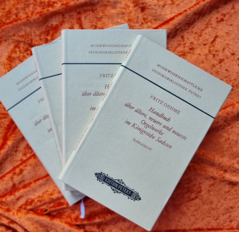 Oehme, Fritz: Handbuch über ältere, neuere und neueste Orgelwerke im Königreiche Sachsen. Reprint der Ausgabe Dresden 1889-1897. 4 Bände (Bände 1 bis 3 + Supplement) Leipzig, Edition Peters, 1978. Ca. 22 x 14 cm. Orig.-Leinenbände mit Schutzumschlag. Gutes Exemplar.