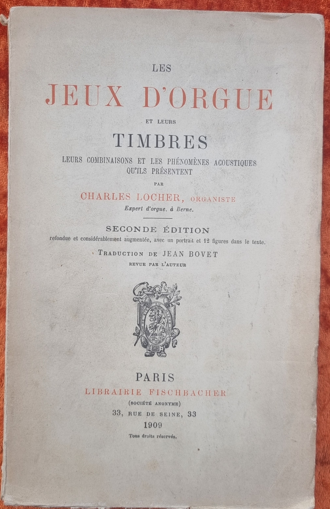 Locher, Charles: Les jeux d’orgue et leurs timbres. Leurs combinaisons et les phénomènes acoustiques ou’ils présentent- 2. Auflage. Paris, Fischbacher, 1909. Ca. 22,5 x 14,5 cm. VIII S., 166 Seiten. Mit Illustrationen. Orig.-Broschur. Breitrandiges, unbeschnittenes Exemplar. Text auf französisch.