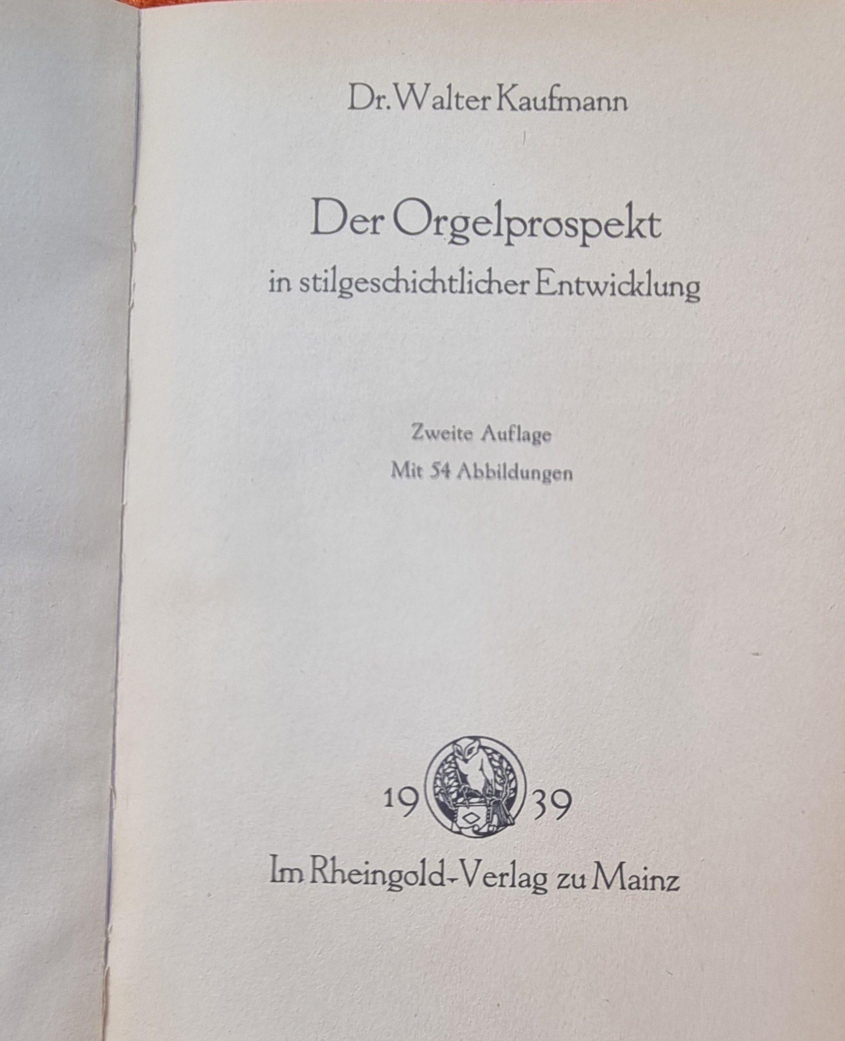 Kaufmann, Walter: Der Orgelprospekt in stilgeschichtlicher Entwicklung. 2. Auflage. Mainz, Rheingold-Verlag, 1939. Ca. 23 x 16,5 cm. 109 Seiten. Mit Abbildungen. Einfacher späterer Halbleinenband. Seiten teils gebräunt, jedoch gutes Exemplar.