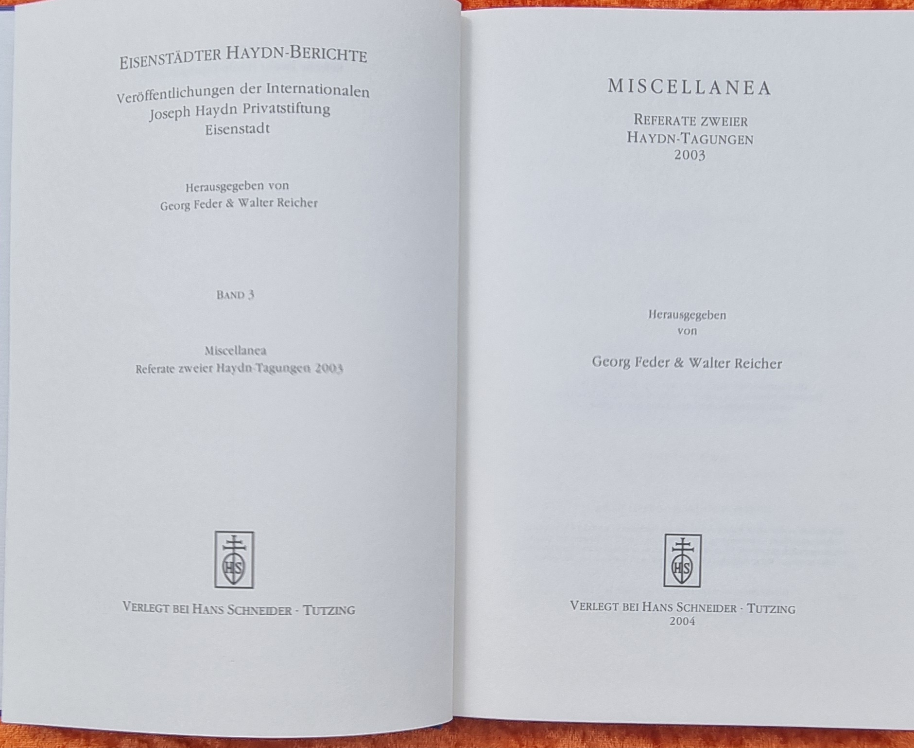 Haydn – Feder, Georg und Walter Reicher (Hrsg.): Miscellanea. Referate zweier Haydn-Tagungen 2003. Tutzing, Hans Schneider, 2004. Ca. 24,5 x 17 cm. 154 Seiten. Mit Notenbeispielen. Blauer Orig.-Leinenband. Aus der Reihe: Eisenstädter Haydn-Berichte, Band 3. In englischer Sprache. Aus dem Inhalt u.a.: B. Proesch: Haydn’s „London“ Symphony and Schoenberg’s Analytic Methods; M. Padmanabhan: Late Eighteenth Century Aesthetic Views and Instances of Humour in Haydn’s German Songs and Part-Songs; E. McCue: Acoustics of the Second Opera House et Eszterhaza.