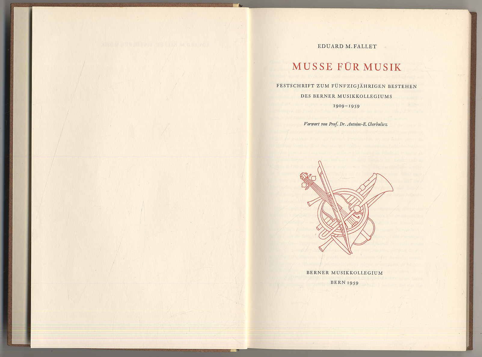 Fallet, Eduard M.: Musse für Musik. Festschrift zum fünfzigjährigen Bestehen des Berner Musikkollegiums 1909-1959. Vorwort von Antonine-E. Cherbuliez. Bern, Bener Musikkollegium, 1959. Ca. 24 x 16,5 cm. 222 S., (2) Seiten. Mit Abbildungen. Orig.-Halbleinenband. Gutes Exemplar.