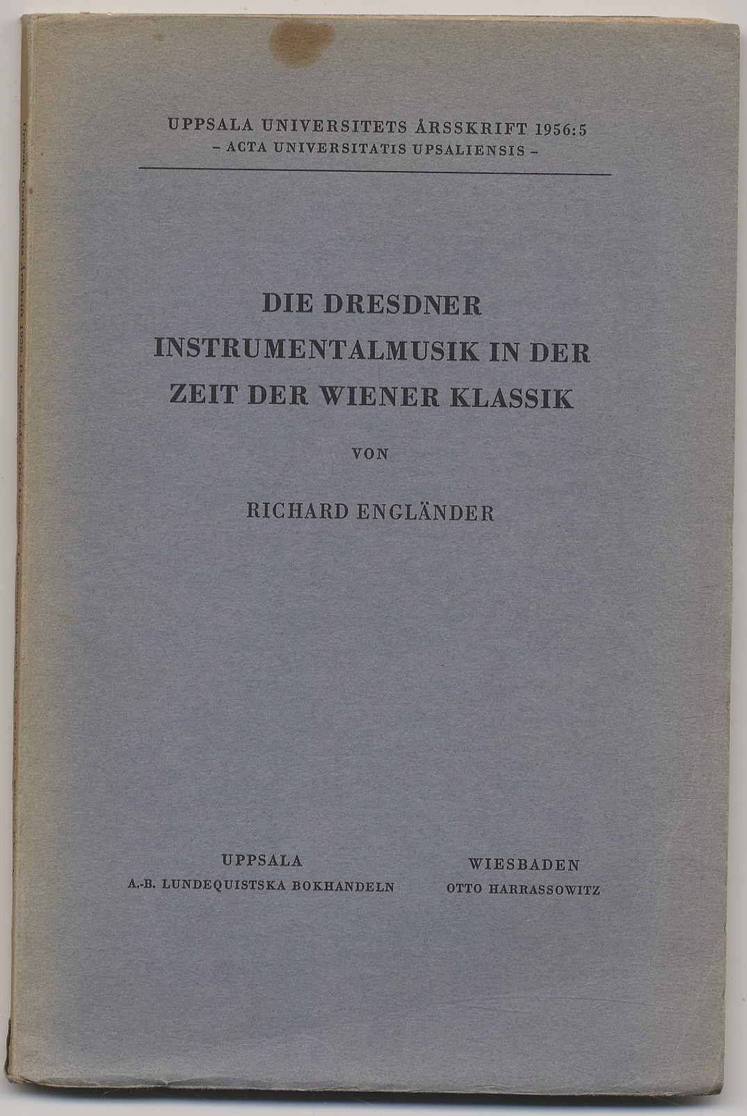 Engländer, Richard: Die Dresdner Instrumentalmusik in der Zeit der Wiener Klassik. Wiesbaden u.a., Otto Harrassowitz, 1956. Ca. 24,5 x 16 cm. 160 Seiten. Mit zahlreichen Notenbeispielen und einem Titelbild. Grauer Originalkartonierter Einband. Aus der Reihe: Uppsala Universitets Ärsskrift 1956:5. Etwas braunfleckig, jedoch gutes Exemplar.
