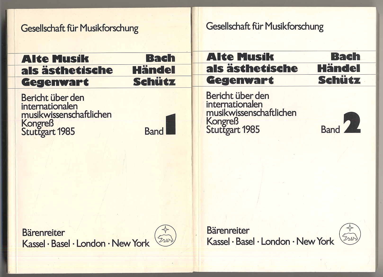 Berke Dietrich und Dorothee Hanemann (Hrsg.): Alte Musik als ästhetische Gegenwart. Bericht über den internationalen musikwissenschaftlichen Kongreß Stuttgart 1985. 2 Bände. Kassel u.a., Bärenreiter, 1985. Ca. 25 x 17,5 cm. XIII S., (2) S., 543 Seiten; (6) S., 475 Seiten. Mit zahlreichen Notenbeispielen. Originalkartonierte Einbände. Aus dem Inhalt u.a.: Schütz in seinem außermusikalischen Umfeld; Alban Berg in den zwanziger Jahren; Werkgattungen und analytische Methoden; Johann Sebatsian Bach – Bach und ein neuer Kunstbegriff; Kompositionstechnik; Bach und Bachrezeption; Georg Friedrich Händel; Alte Musik; Aufführungspraxis. Gutes Exemplar.