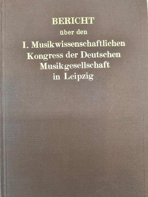 Bericht über den I. Musikwissenschaftlichen Kongreß der Deutschen Musikgesellschaft in Leipzig 1925. Leipzig, Breitkopf & Härtel, 1926. Ca. 23 x 16,5 cm. X S., 470 Seiten. Mit zahlreichen Notenbeispielen. Brauner Orig.-Leinenband. Mit Exlibris. Aus dem Inhalt u.a.: Bibliographie der Musik; Vergleichende Musikwissenschaft und Instrumentenkunde; Metholdik der Musikwissenschaft; Musikalische Jugenderziehung; Geschichte der Musik im Altertum und Mittelalter; Protestantische Kirchenmusik; G. Adler: Das obligate Akkompagnement der Wiener klassischen Schule; W. Gurlitt: ÜberPrinzipien und zur Geschichte der Registrierkunst in der alten Orgelmusik. Gutes Exemplar.