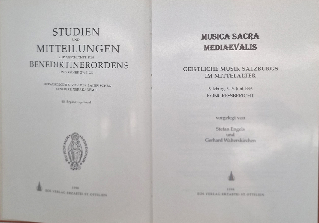 Engels, Stefan u.a.: Musica sacra mediaevalis. Geistliche Musik Salzburgs im Mittelalter. Salzburg 6.-9. Juni 1996 Kongressbericht. St. Ottilien, EOS Verlag, 1998. Ca. 24,5 x 17,5 cm. 143 Seiten. Mit Abbildungen. Orig.-Pappband. Aus der Reihe: Studien und Mitteilungen zur Geschichte des Benediktinerordens, 40. Ergänzungsband. Gutes Exemplar.
