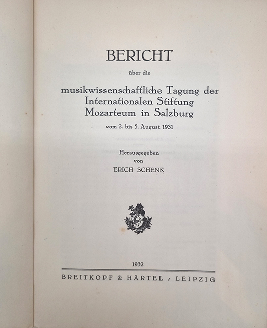 Mozart – Schenk, Erich (Hrsg.) Bericht über die musikwissenschaftliche Tagung der Internationalen Stiftung Mozarteum in Salzburg vom 2. bis 5. August 1931. Leipzig, Breitkopf & Härtel, 1932. Ca. 25 x 18 cm. XII S., 312 S., (4) Seiten. Originalkartonierter Einband. Einbandhinterdeckel lichtrandig. Einband und Schnitt etwas stockfleckig. Mit Exlibris. Aus dem Inhalt u.a.: L. Schiedermair: Das deutsche Mozartbild; L. Schrade: Mozart und die Romantiker; Fausto torrefranca: Mozart e il quartiette italiano; Paul Nettl: Mozarts Prager Kontertänze; Oskar Kaul: Zur Instrumentation Mozarts; H. Engel: Musisoziologie und musikalische Volkskunde. P. Nettl: „Sethos2 und die freimaurerische Grundlage der „Zauberflöte“. Beiträge überwiegend auf Deutsch.