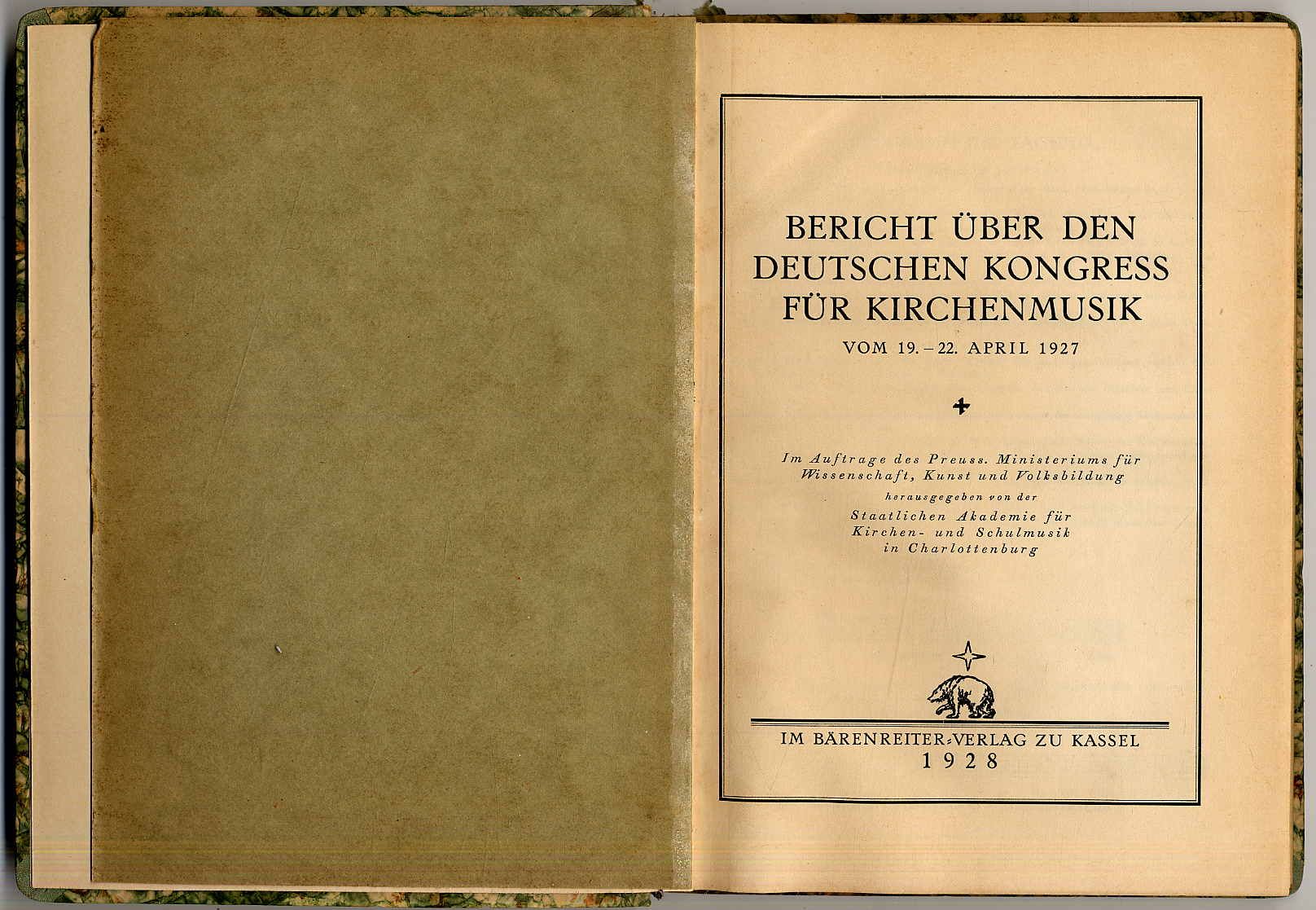 Staatl. Akademie für Kirchen- und Schulmusik in Charlottenburg (Hrsg.): Bericht über den deutschen Kongress für Kirchenmusik vom 19. – 22. April 1927. Kassel, Bärenreiter Verlag, 1928. Ca. 25 x 18 cm. 128 Seiten. Pappband mit eingebundener Originalbroschur. Rücken bestoßen. Aus dem Inhalt u.a.: Smend: Die notwendige Beziehung zwischen dem Kirchenmusiker und dem Vertreter des Predigtamts; Platz: Die liturgischen Aufgaben des Organisten und Chordirigenten; Lechthaler: Der katholische Organist als Baumeister des liturgischen Gesamtkunstwerkes; Johner: Wie gelangen wir zu einem würdigen Vortrag des gregorianischen Chorals.