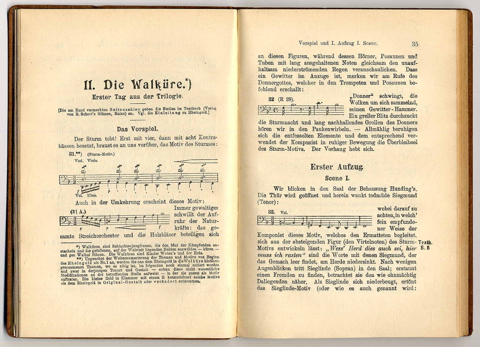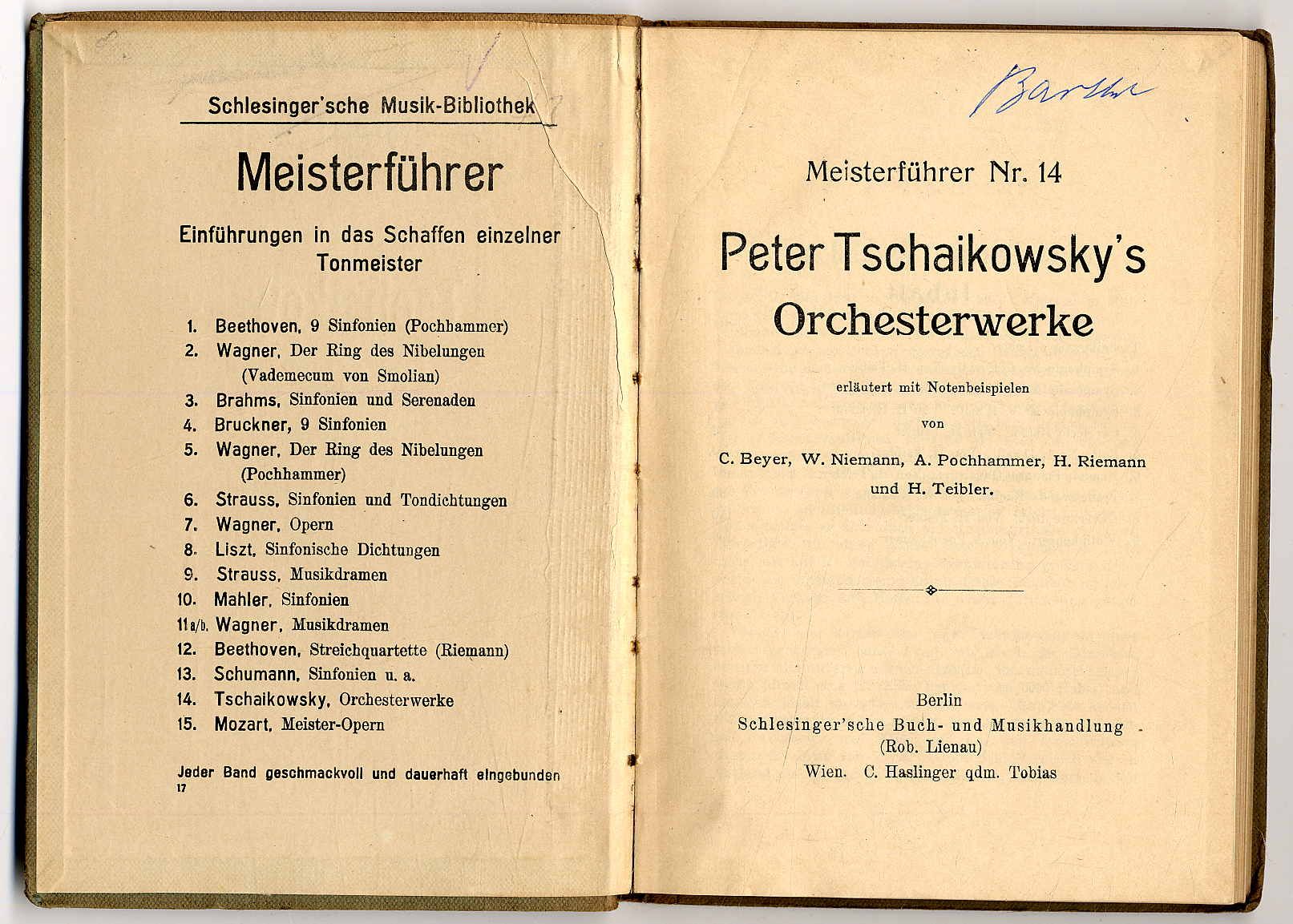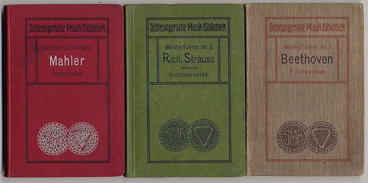 Schlesingersche Musik-Bibliothek – Konvolut. Vorhanden sind die „Meisterführer“, Bände: Nr. 1 Beethoven’s Symphonien; 3 Brahms Symphonien und andere Orchesterwerke; 4 Bruckner’s Symphonien; 5 Richard Wagner’s Der Ring des Nibelungen; 6 Richard Strauss Symphonien und Tondichtungen; 7 Richard Wagners Opern; 8 Liszt, Symphonische Dichtungen; 9 Richard Strauss Musikdramen, 10 Mahlers Symphonien; 12 Beethoven’s Streichquartette; 13 Rob. Schumann’s Symphonien; 14 Tschaikowsky’s Orchesterwerke; 15 Mozarts Meisteropern; 16 Max Reger Orchesterwerke. Berlin, Schlesinger’sche Buch- und Musikhandlung, 1910/1920er Jahre. Ca. 18,5 x 12,5 cm. Je Band zwischen 125 und 222 Seiten. Mit zahlreichen Notenbeispielen. Orig.-Leinenbände. Aus der Reihe: Schlesinger’sche Musik-Bibliothek. 14 Bände aus der Reihe. Einbände teils etwas berieben bzw. fleckig, einige Rücken bestoßen. Teils mit Stempel auf Titelblatt. Schnitt etwas fleckig. Erläutert mit Notenbeispielen und teils mit biographischen Einleitungen.