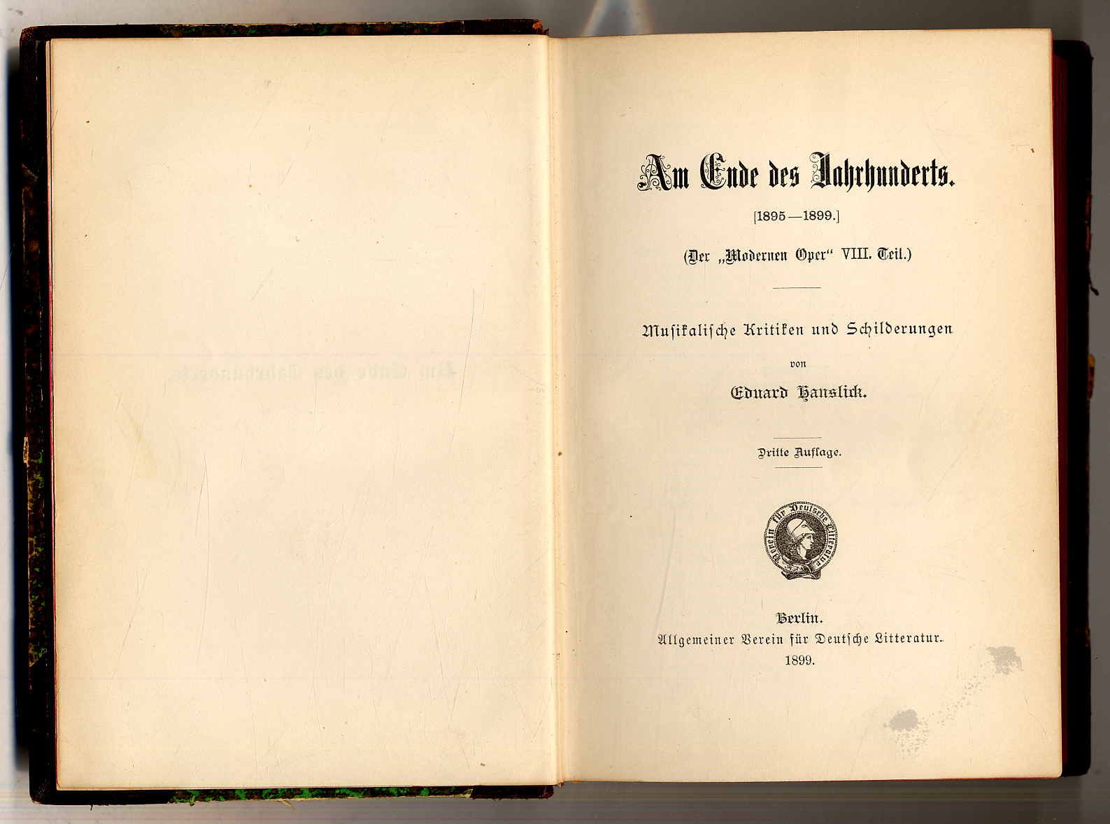 Hanslick, Eduard: Am Ende des Jahrhunderts (1895-1898). (Der „Modernen Oper“ VIII. Teil). Musikalische Kritiken und Schilderungen. Berlin, Allgemeiner Verein für Deutsche Litteratur, 1899. Ca. 21 x 15 cm. VI S., 452 Seiten + Werbeanhang. Halblederband der Zeit. Einbandkanten etwas bestoßen, sonst gutes Exemplar.