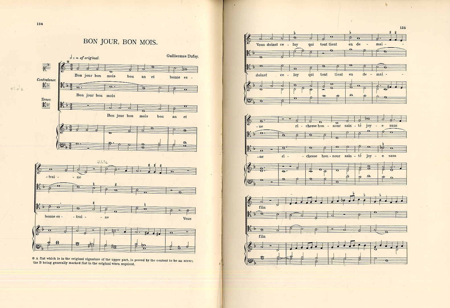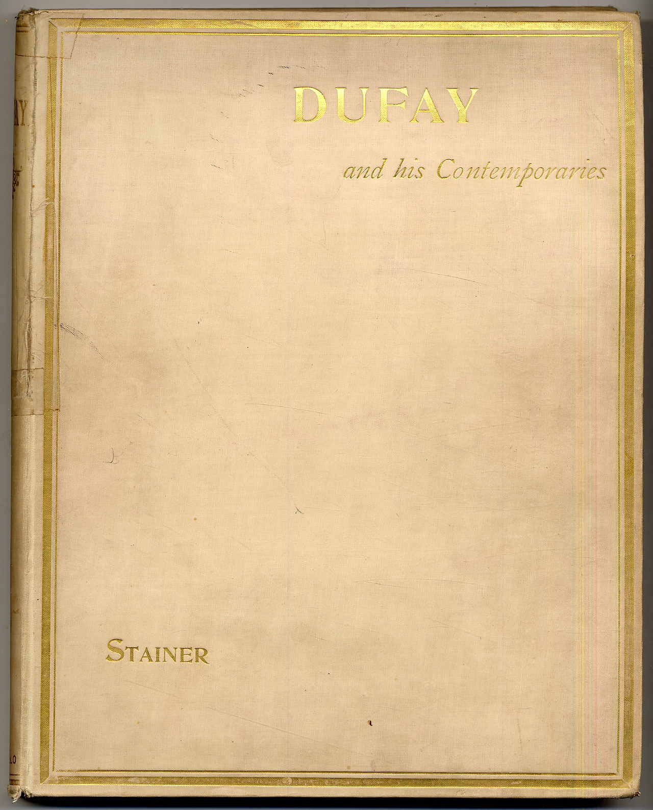 Dufay – Stainer, J.F.R. u.a.: Early Bodleian Music. Dufay and his contemporaries. Fifty Compositions (Ranging from about A.D. 1400 to 1440). Transcribed from MS. Canonici misc. 213, in the Bodleian Library, Oxford by J.F.R. Stainer and C. Stainer. With an Introduction by E.W.B. Nicholson and a Critical Analysis of the Music by J. Stainer. London u.a., Novello and Comp., u.a. 1898. Ca. 32 x 22,5 cm. XIX S., (3) Seiten, 8 ganzseitige Faksimiles. Mit zahlreichen Notenbeispielen. Orig.-Pappband mit Goldprägung. Text auf Englisch. Einband etwas fleckig und leicht gebogen, Rücken bestoßen. Buchblock leicht gelockert, Titelblatt am Falz mit Klebestreifen verstärkt. Early Bodleian Music. Guillaume Dufay (um 1490-1474, Komponist).