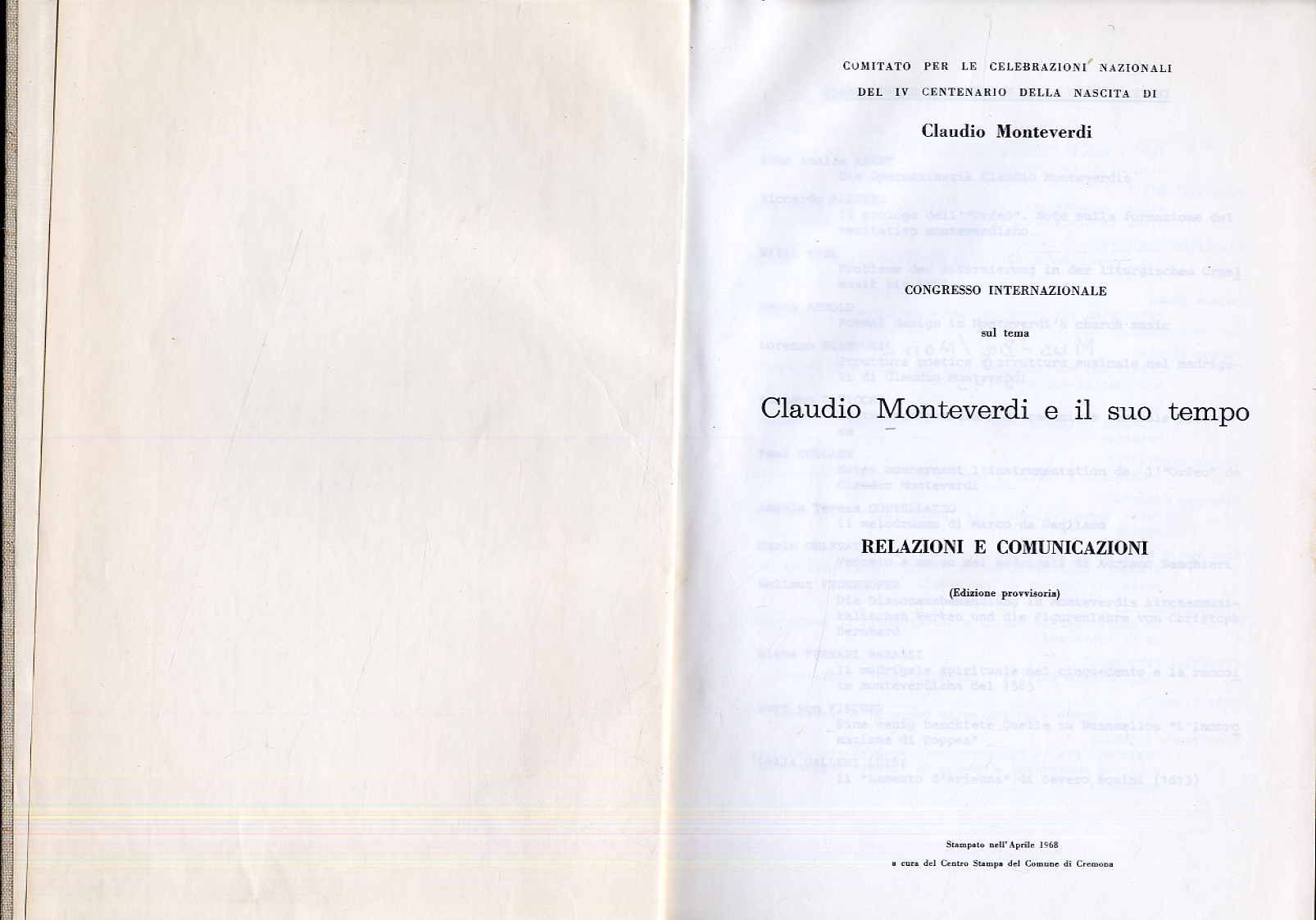 Monteverdi – Congresso internazionale sul tema Claudio Monteverdi e il suo tempo. Cremona, 1968. Ca. 32 x 22 cm. Nicht durchgehend paginiert. Mit Notenbeispielen. Orig.-Leinenband. Hektographie. Aus der Handbibliothek des Verlages Moeck. Text auf Italienisch.