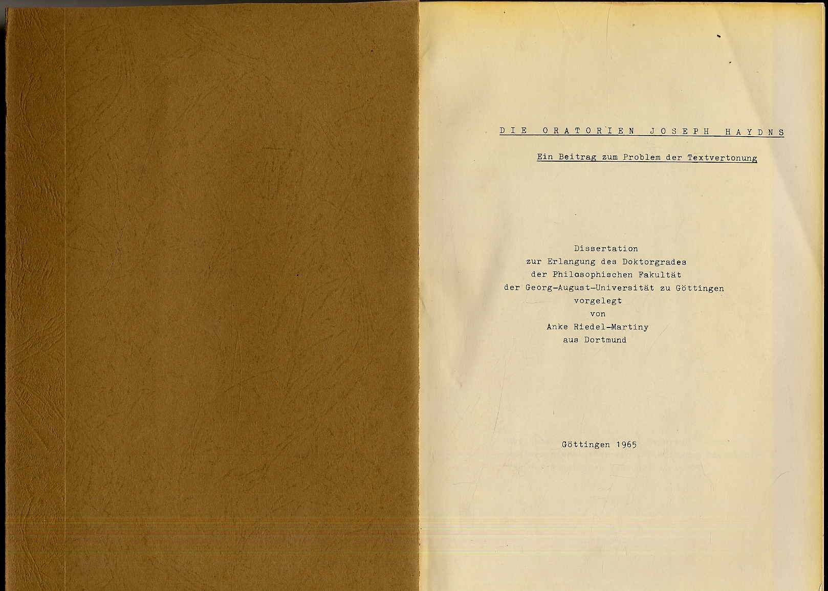 Haydn – Riedel-Martiny, Anke: Die Oratorien Joseph Haydns. Ein Beitrag zum Problem der Textvertonung. Göttingen, 1965. Ca. 29 x 21,5 cm. (8) S., 265 einseitig bedruckte Blätter, (2) Seiten. Einfacher kartonierter Einband. Dissertation der Politikerin Riedel-Martiny (1939-2016). Gutes Exemplar.