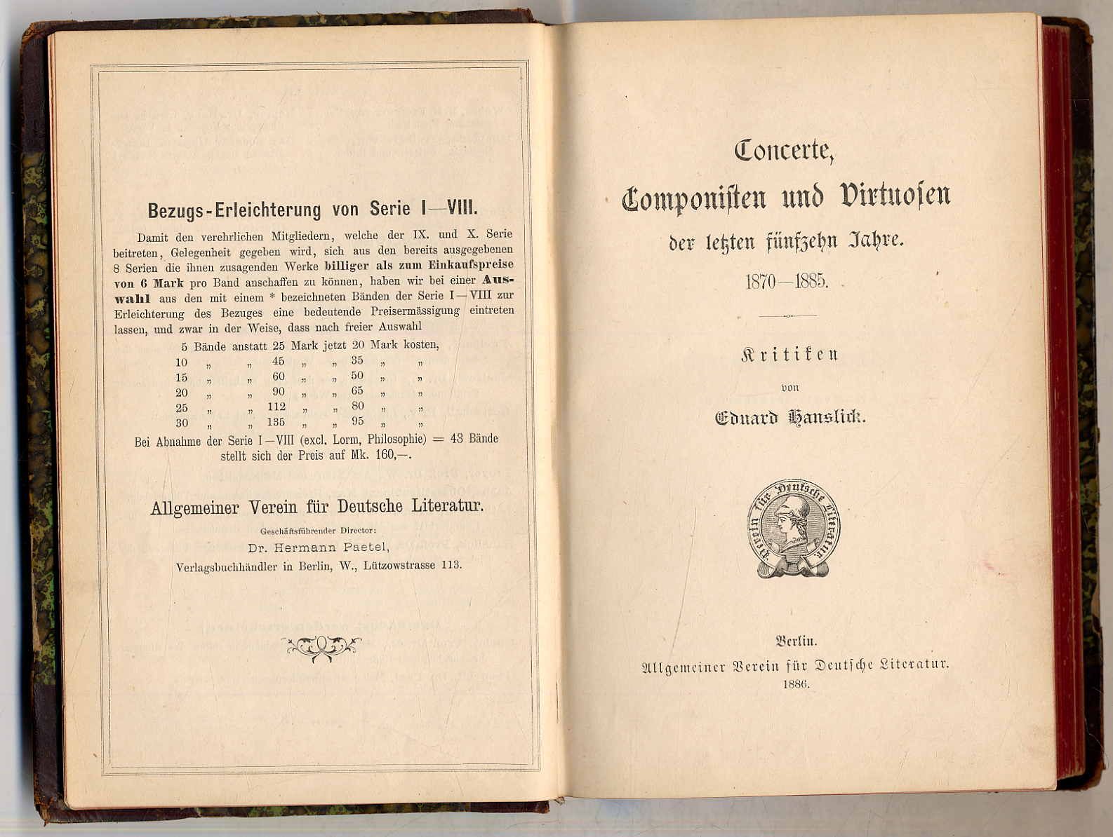 Hanslick, Eduard: Concerte, Componisten und Virtuosen der letzten fünfzehn Jahre 1870-1885. Kritiken. Berlin, Allgemeiner Verein für Deutsche Literatur, 1886. Ca. 18,5 x 13 cm. (10) S., 447 Seiten. Orig.-Halblederband. Widmungsblatt mit Besitzvermerk. Einbandleder etwas beschabt, sonst gutes Exemplar.