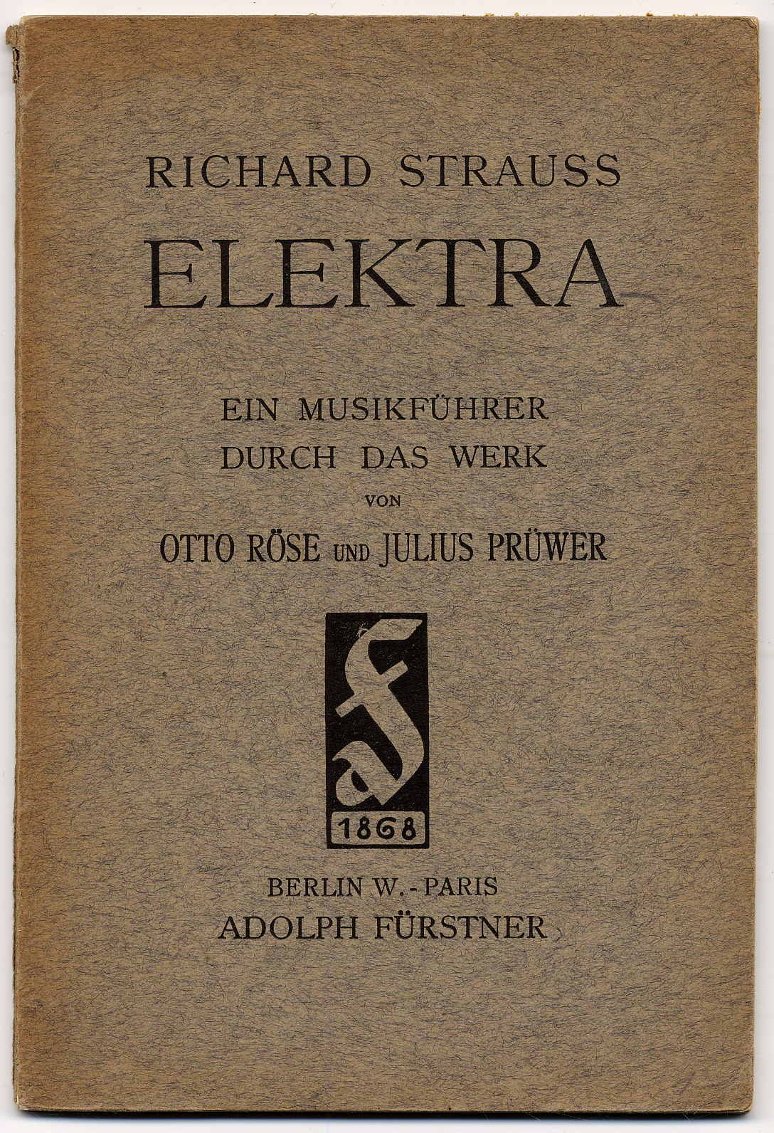 Strauss – Röse, Otto und Julius Prüwer: Richard Strauss. Elektra. Ein Musikführer durch das Werk. Berlin, Adolph Fürstenberg, 1909. Ca. 18,5 x 12,5 cm. 42 Seiten. Mit Titelbild und Notenbeispielen. Originalkartonierter Einband. Die enthaltene Faksimileseite ist die einzige derartige Abbildung der Elektrapartitur.