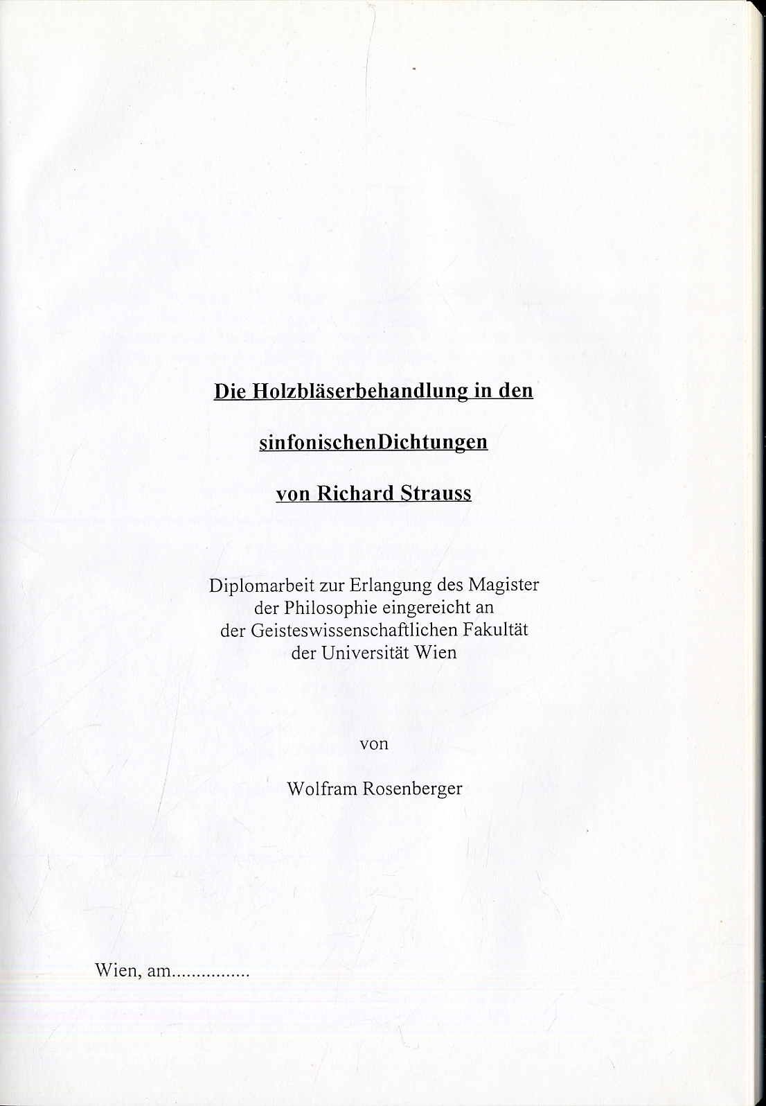 Strauss – Rosenberger, Wolfram: Die Holzbläserbehandlung in den sinfonischen Dichtungen von Richard Strauss. Wien, 1980er Jahre. Ca. 30 x 20,5 cm. 165 einseitig bedruckte Blätter. Mit Notenbeispielen. Schwarzer Orig.-Leinenband. Diplomarbeit zur Erlangung des Magister der Philosophie. Gutes Exemplar.