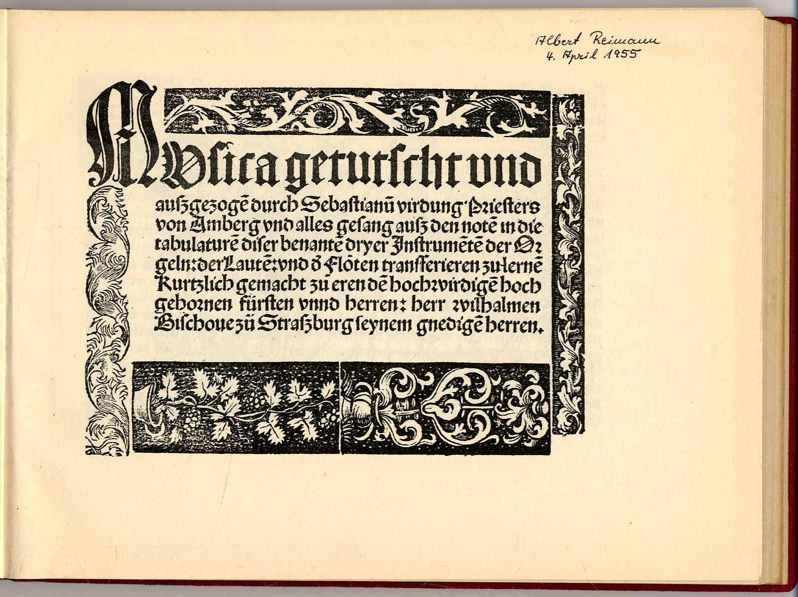 Virdung, Sebastian: Musica getutscht. Originalgetreuer Nachdruck der Ausgabe Basel 1511. Herausgegeben von Leo Schrade. Kassel, Bärenreiter Verlag, 1931. Querformat, ca. 16,5 x 22 cm. 62 handschriftlich nummerierte Blätter. Roter Orig.-Leinenband. Faksimile. Gutes Exemplar.