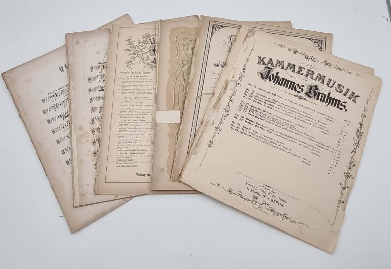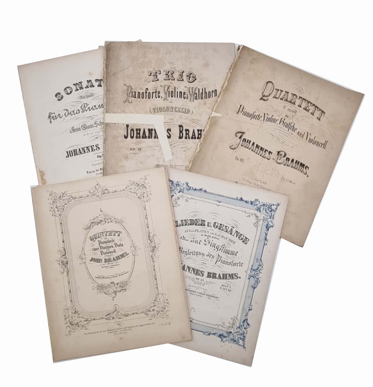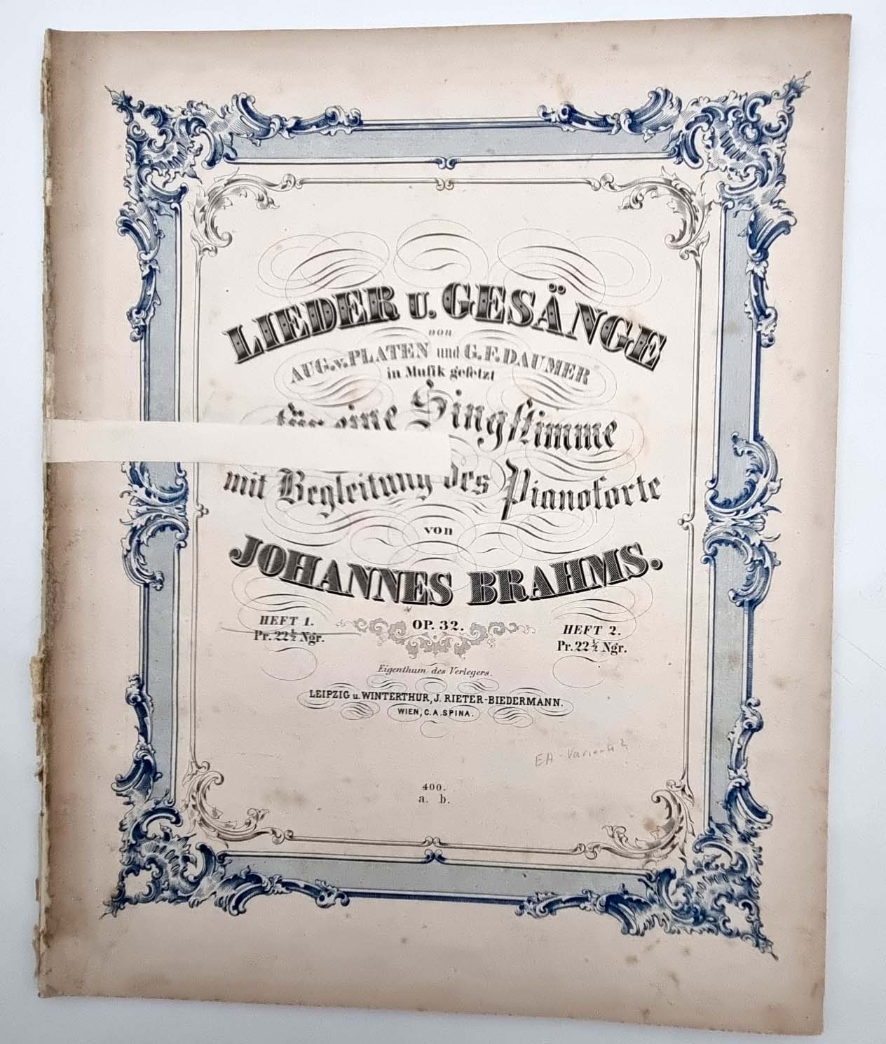 Brahms, Johannes: Konvolut Noten. 1) Quartett C moll für das Pianoforte, Violine, Bratsche und Violoncell. Berlin, N. Simrock, 1875. Partitur, 51 Seiten. Umschlag und Rücken Einrirsse hinterlegt. Stockfleckig. 2) Sonate Fis moll für das Pianoforte componirt und Frau Clara Schumann verehrend zugeeignet. Leipzig, Breitkopf & Härtel. 27 Seiten. Umdruck der Erstausgabe; 3) Quintett für Pianoforte, zwei Violinen, Viola und Violoncell. Op. 34. Preisangabe: „Pr 13 Mark“. Partitur, um 1876; 4) Lieder u. Gesänge von Aug. v. Platen und G. F. Daumer in Musik gesetzt für eine Singstimme mit Begleitung des Pianoforte. Op. 32. 2 Hefte, je 13 Seiten. Leipzig u. Winterthur, J. Rieter-Biedermann und Wien C. A. Spina. Plattennummer 400a und 400b. Preisangabe: „Pr. 22 1/2 Ngr.“. Titelseite mit quer überklebtem Einriss; 5) Trio für Pianoforte, Violine & Waldhorn oder (Violoncello). Op. 40. Bonn bei N. Simrock. Plattennummer 6503. 33 Seiten, Partitur. Preisangabe: „Preis 15 Francs.“ 1866. Erstdruck. Titelblatt mittig mit überklebtem Einriss, am unteren Rand ca. 4 cm breit überklebt. Stockfleckig. Ca. 32 x 25,5 cm. Mit einem Erstdruck. Jeweils ausgebundene Exemplare, ohne Einbände. Rücken stärker bestoßen, teils mit kleineren Randenrissen. Seiten teils stockfleckig. Noch 5 weitere Notenhefte beigefügt.