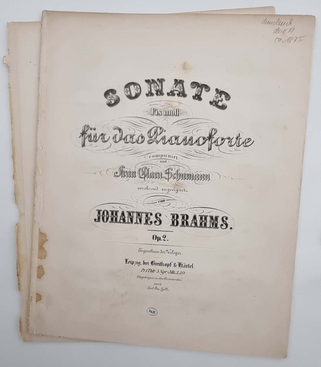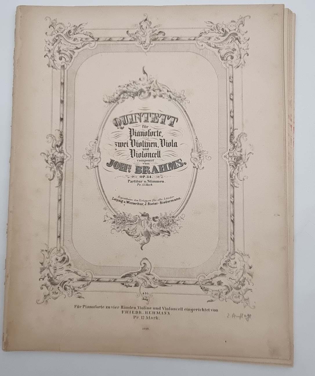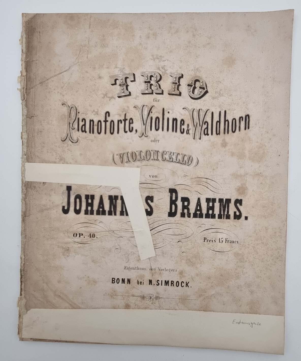 Brahms, Johannes: Konvolut Noten. 1) Quartett C moll für das Pianoforte, Violine, Bratsche und Violoncell. Berlin, N. Simrock, 1875. Partitur, 51 Seiten. Umschlag und Rücken Einrirsse hinterlegt. Stockfleckig. 2) Sonate Fis moll für das Pianoforte componirt und Frau Clara Schumann verehrend zugeeignet. Leipzig, Breitkopf & Härtel. 27 Seiten. Umdruck der Erstausgabe; 3) Quintett für Pianoforte, zwei Violinen, Viola und Violoncell. Op. 34. Preisangabe: „Pr 13 Mark“. Partitur, um 1876; 4) Lieder u. Gesänge von Aug. v. Platen und G. F. Daumer in Musik gesetzt für eine Singstimme mit Begleitung des Pianoforte. Op. 32. 2 Hefte, je 13 Seiten. Leipzig u. Winterthur, J. Rieter-Biedermann und Wien C. A. Spina. Plattennummer 400a und 400b. Preisangabe: „Pr. 22 1/2 Ngr.“. Titelseite mit quer überklebtem Einriss; 5) Trio für Pianoforte, Violine & Waldhorn oder (Violoncello). Op. 40. Bonn bei N. Simrock. Plattennummer 6503. 33 Seiten, Partitur. Preisangabe: „Preis 15 Francs.“ 1866. Erstdruck. Titelblatt mittig mit überklebtem Einriss, am unteren Rand ca. 4 cm breit überklebt. Stockfleckig. Ca. 32 x 25,5 cm. Mit einem Erstdruck. Jeweils ausgebundene Exemplare, ohne Einbände. Rücken stärker bestoßen, teils mit kleineren Randenrissen. Seiten teils stockfleckig. Noch 5 weitere Notenhefte beigefügt.
